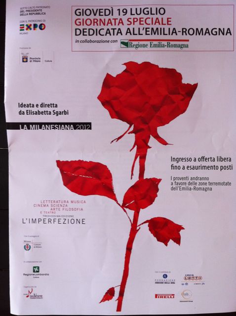 Alla Milanesiana, su invito di Elisabetta Sgarbi, con il sindaco di Ferrara Tagliani, di Finale Emilia Ferioli, di Ro Parisini, con Roberto Pazzi, giornalisti e poeti a parlare di Emilia, Ferrara, terremoti.