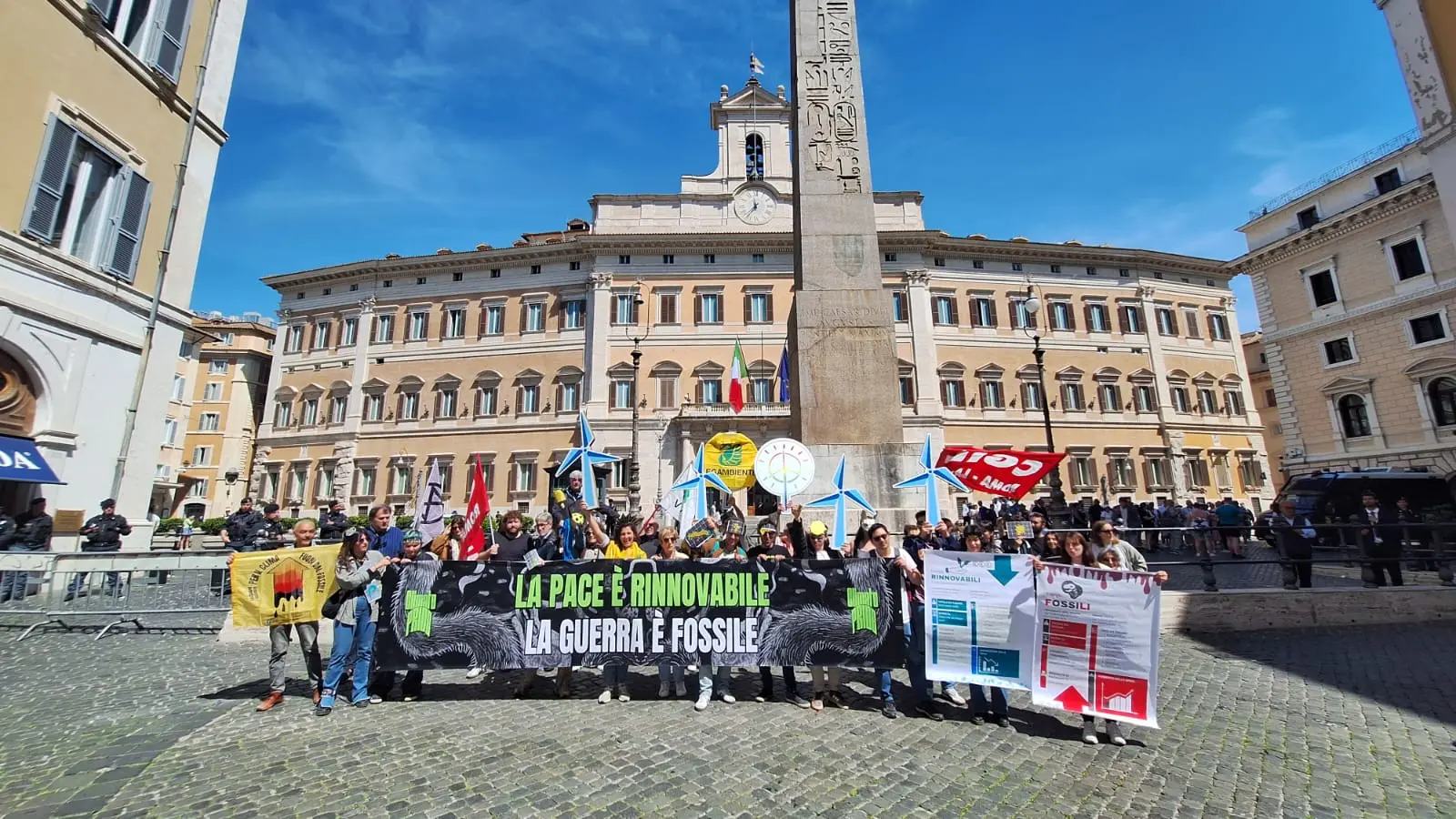 “La pace è rinnovabile, la guerra è fossile” è il messaggio lanciato dalla rete delle organizzazioni ambientaliste e della società civile, tra cui Cgil, A Sud, Extinction Rebellion, Fridays for Future, Greenpeace, Legambiente e Wwf. Gli attivisti si sono presentati con pale eoliche e pannelli solari, in contrapposizione a una grande bolletta, per richiamare governo e parlamento sui costi che i cittadini in Italia stanno pagando anche a livello economico a causa della dipendenza dai combustibili fossili.