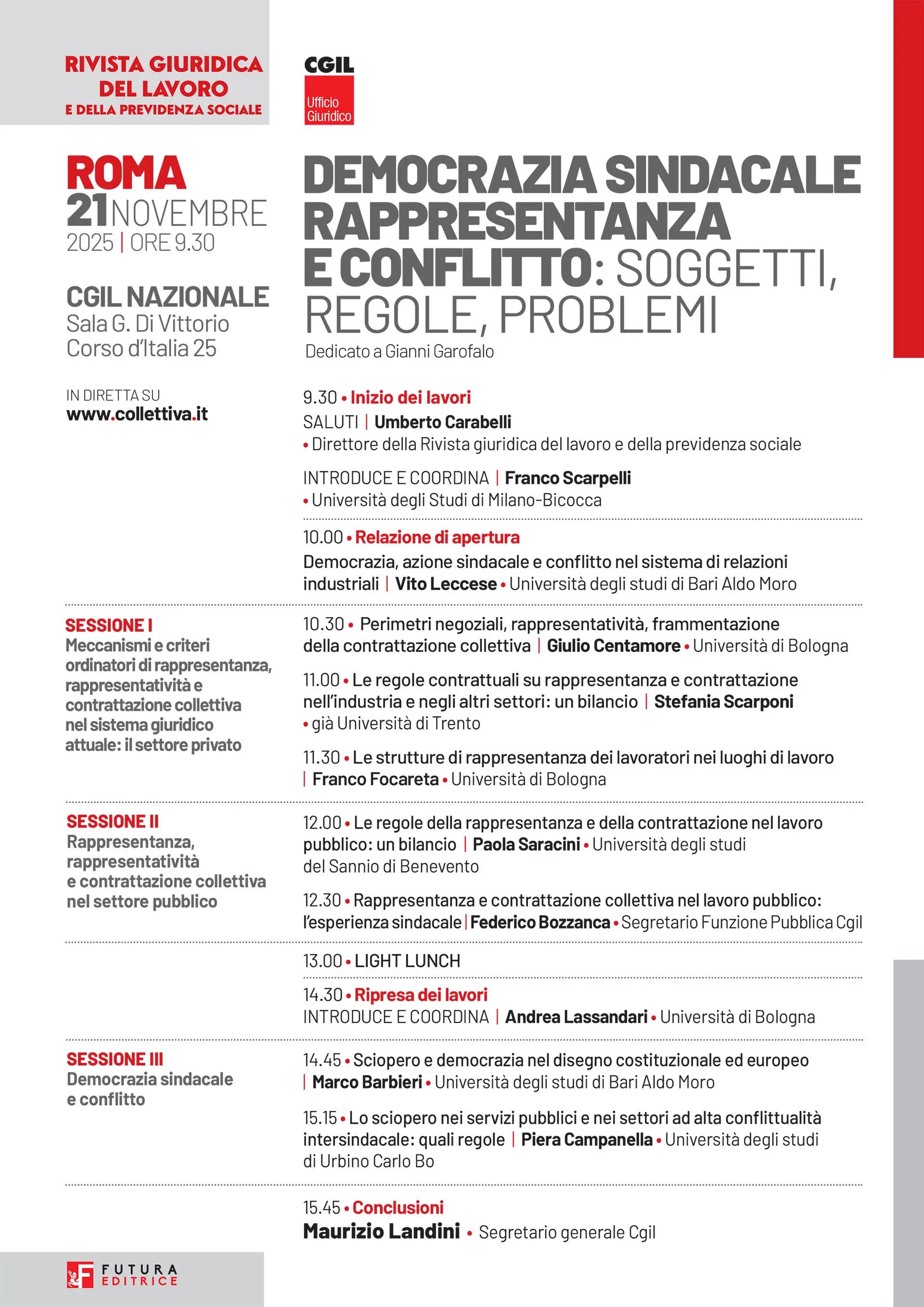 Si terrà in Sala Di Vittorio, nella sede della Cgil Nazionale, l’ultimo dei quattro convegni dal titolo “Lavoro e Democrazia”, i primi declinati sui temi della politica (Bologna, 23 maggio), della società (Milano, 16 giugno), dell’economia (Napoli, 22 ottobre), mentre il prossimo venerdì 21 novembre, a partire dalle ore 9,30, sarà il rapporto con il sindacato il centro della discussione, che verrà aperta da Umberto Carabelli, direttore della Rivista giuridica del lavoro e della previdenza sociale, organizzatrice di questo e degli altri incontri.