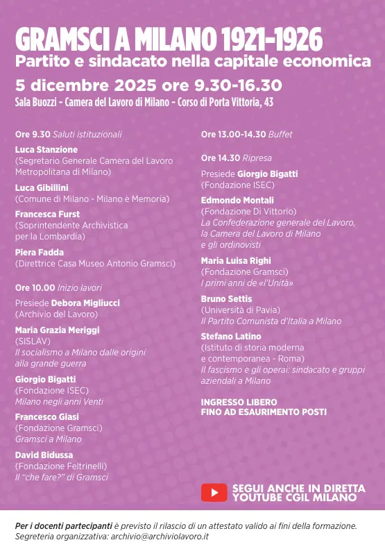 Alla Camera del lavoro milanese, il prossimo venerdì 5 dicembre, "Gramsci a Milano 1921–1926. Partito e sindacato nella capitale economica”, un convegno presso la Sala Buozzi promosso da Archivio del Lavoro – Cgil Milano, Fondazione Di Vittorio, Fondazione Gramsci e Fondazione Isec, in collaborazione con la Casa museo Antonio Gramsci, il Comune di Milano – Milano è Memoria e Aamod.