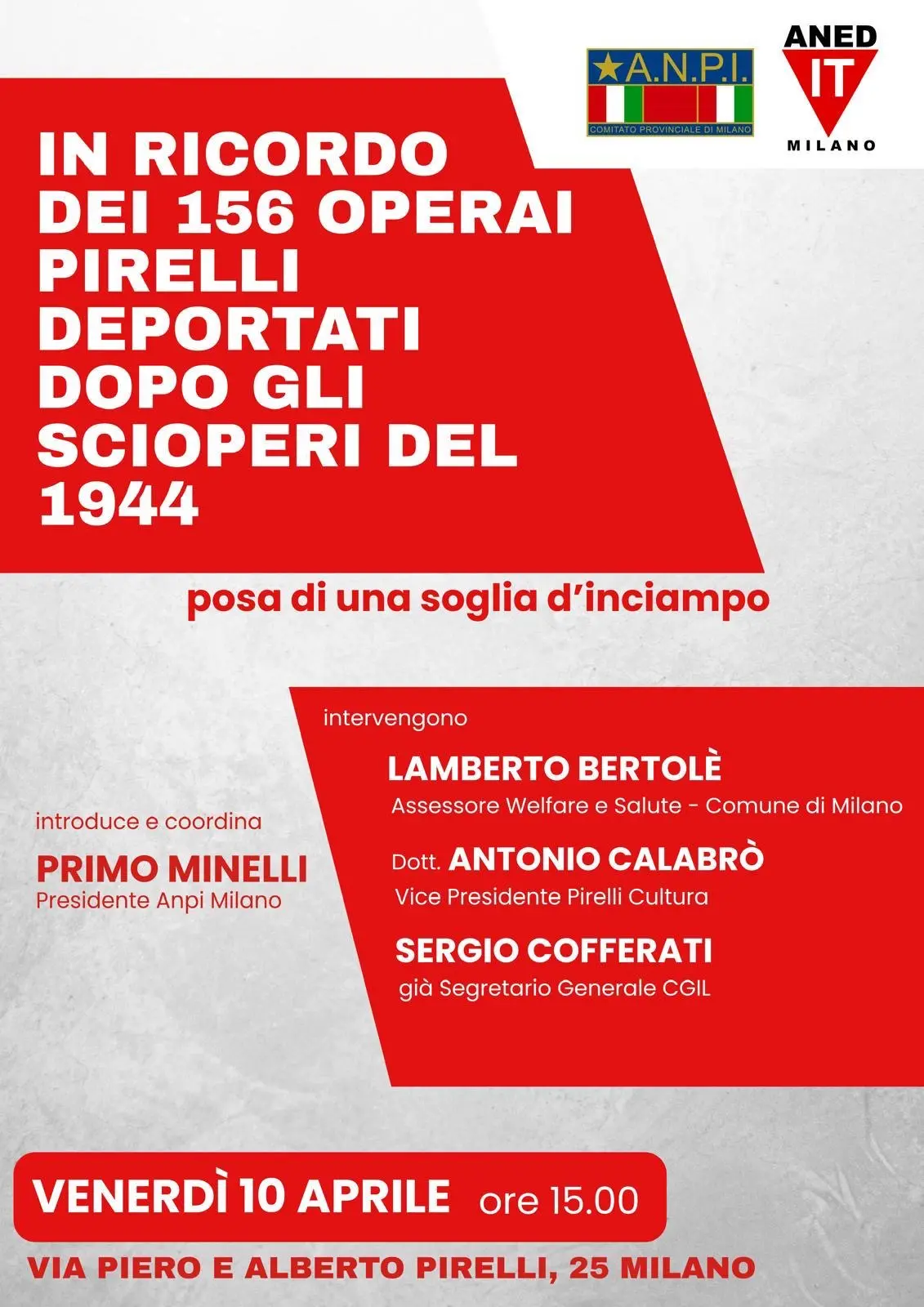 Milano aggiunge oggi, 10 aprile, un nuovo luogo alla sua mappa della memoria. In via Piero e Alberto Pirelli 25, nel cuore della Bicocca, sarà posata una soglia d’inciampo dedicata ai 156 operai della Pirelli deportati nei campi di lavoro nazisti nel novembre 1944. L’iniziativa, promossa da Anpi e Comune di Milano, coinvolge lavoratrici e lavoratori, la Rsu e la Filctem Cgil di Milano e nazionale.