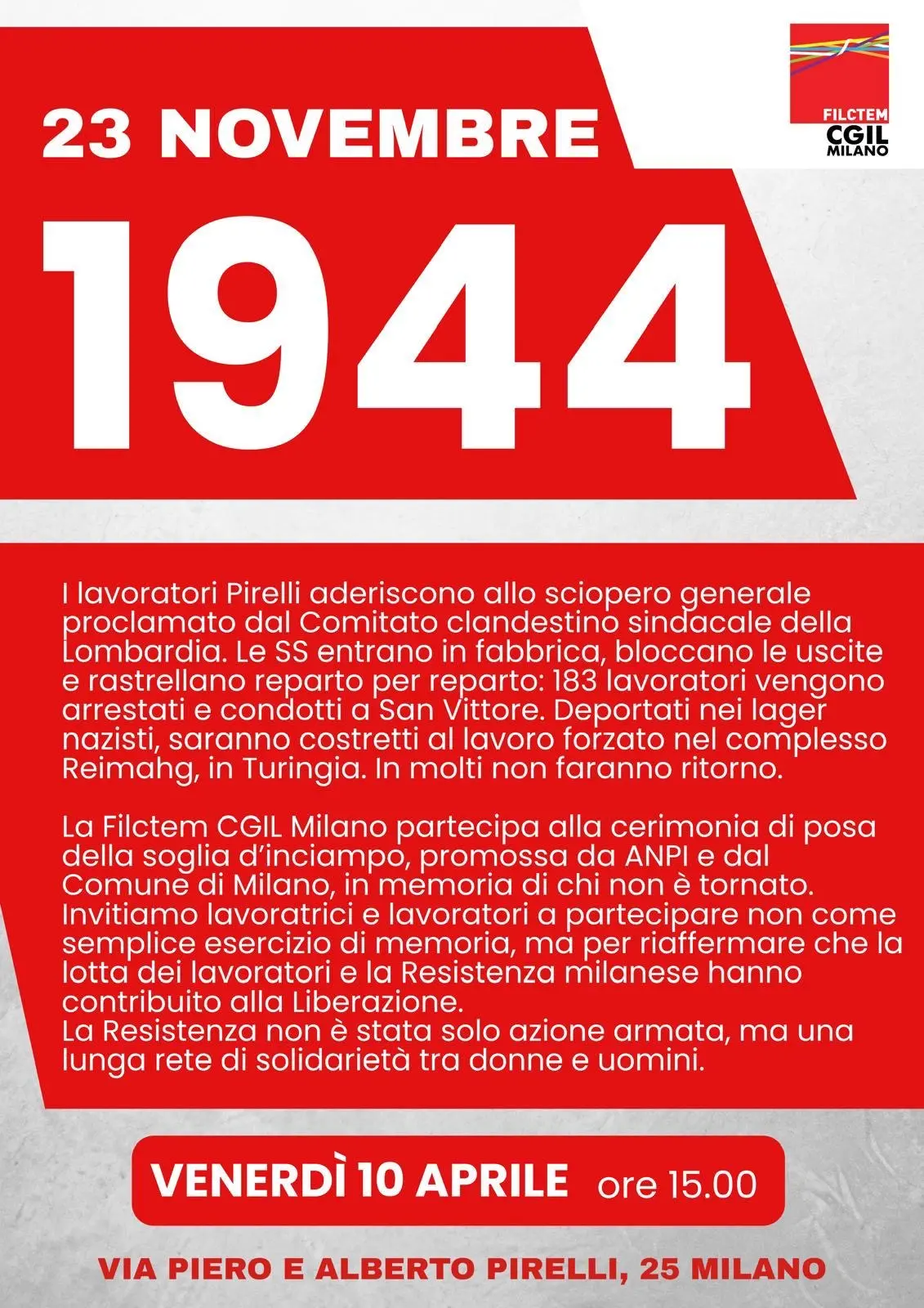 La soglia d’inciampo davanti allo stabilimento aggiunge un nuovo segno a quella memoria per tenere vivo il legame tra quelle vicende e il presente. Alla cerimonia partecipano lavoratrici e lavoratori, la Rsu e la Filctem Cgil di Milano e nazionale, insieme alle associazioni, istituzioni, azienda e Fondazione Pirelli che hanno promosso l’iniziativa.