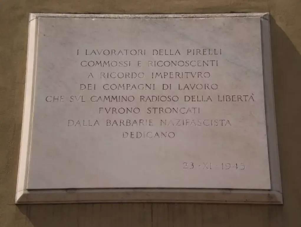 La Resistenza operaia continua fino all’insurrezione finale dell’aprile 1945, nonostante la repressione e la chiusura delle fabbriche. Il sacrificio dei lavoratori della Pirelli viene ricordato con una targa dedicata ai “compagni di lavoro che sul cammino radioso della libertà furono stroncati dalla barbarie nazifascista”, murata sul fabbricato 95 il 23 novembre 1945, ancora oggi presente all’interno del quartier generale della Bicocca.