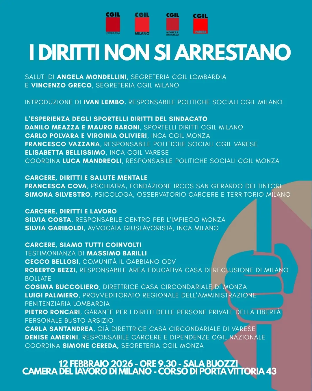 “I diritti non si arrestano, nemmeno dietro le sbarre”. È il messaggio al centro del convegno che si è svolto oggi, 12 febbraio, presso la Camera del Lavoro di Milano, organizzato da Cgil Lombardia, Cgil Milano, Cgil Varese e Cgil Monza e Brianza. Una mattinata di lavori dedicata alla tutela dei diritti delle persone detenute e all’azione degli sportelli sindacali negli istituti penitenziari.