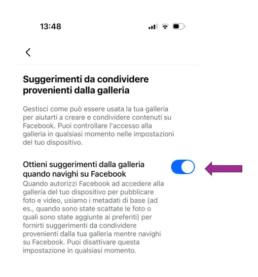 4. Disattiva “Ottieni suggerimenti dalla galleria quando navighi su Facebook”.