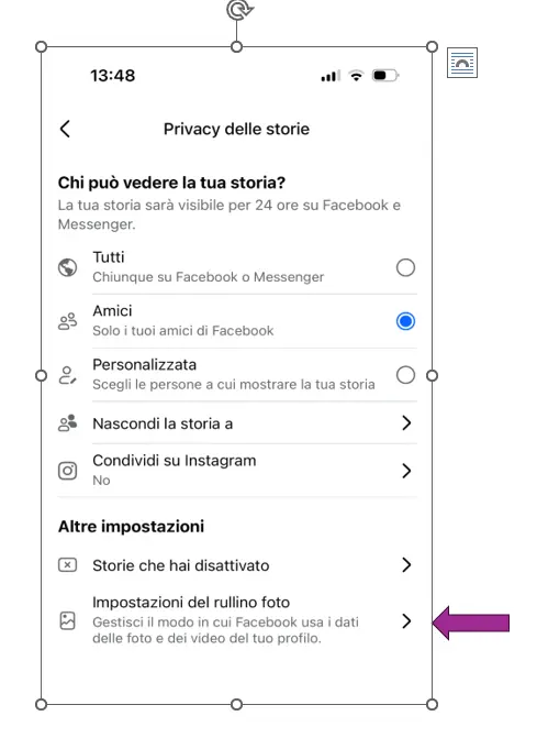 Nota: se usi Facebook con più dispositivi, i suggerimenti della galleria si applicano a tutti i tuoi dispositivi. Puoi modificare le autorizzazioni relative a foto e video per l'app Facebook nelle impostazioni del tuo dispositivo: https://www.facebook.com/help/1020723939310416/?helpref=uf_share, dove trovi le istruzioni (per IPhone e per Android).