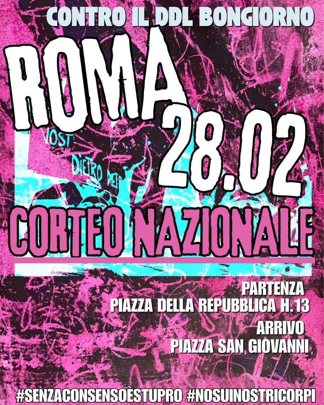 Ancora in piazza contro il “nuovo” ddl Bongiorno: quello che, passando dal concetto di “consenso” a quello di “dissenso”, ha stravolto del tutto il disegno di legge che, nella prima versione, a novembre, aveva fatto registrare un consenso bipartisan. L’appuntamento è per oggi (28 febbraio) a Roma dove alle 13 partirà il corteo che, da piazza della Repubblica raggiungerà piazza San Giovanni in Laterano.