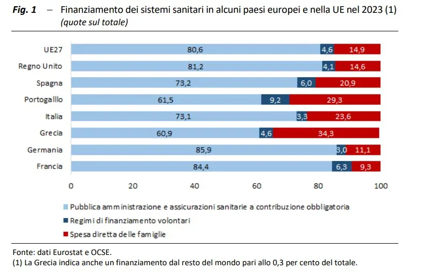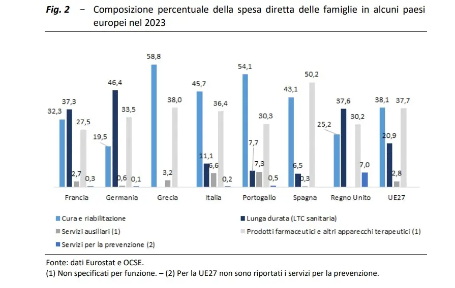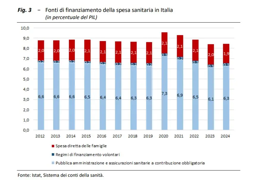 Quello italiano, come quello di altri paesi europei, è un sistema sanitario ibrido: pubblico e privato. La questione è che la quota di privato aumenta, sia quella acquistata dal pubblico che quale pagata direttamente dalle famiglie, mentre il finanziamento pubblico diminuisce. Secondo l’Upb “quasi un terzo della spesa pubblica è destinato a servizi erogati da fornitori privati”. Tradotto significa che il Ssn acquista” servizi da soggetti privati. Ospedali, Rsa, laboratori e cooperative che erogano servizi ai cittadini e alle cittadine pagate dal pubblico.