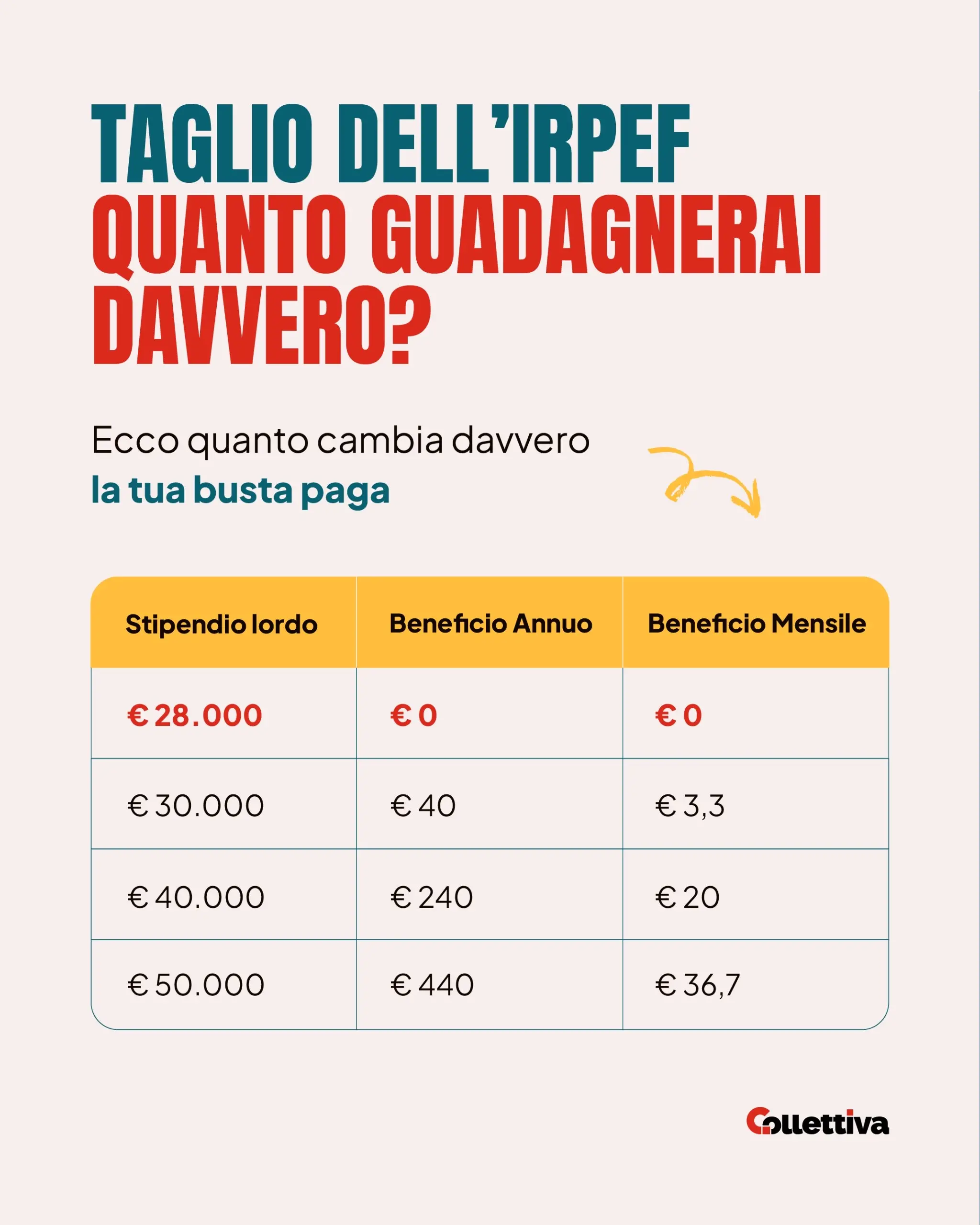L’Irpef è l’imposta sul reddito delle persone fisiche, quella tassa che per oltre l’80% pagano lavoratori e lavoratrici dipendenti, pensionate e pensionate. Quando fu pensata rispondeva al dettato costituzionale della progressività, oggi, viste le diverse riforme fiscali a pezzi e i diversi regimi di imposta tra categorie di contribuenti differenti, l’intero sistema fiscale non risponde più pienamente a quel criterio. Oggi funziona così fino a 28 mila euro di reddito si paga il 23%, tra 28 e 50 mila euro il 35% e oltre i 50 mila il 43%. Dal 1 gennaio 2026 il secondo scaglione passerà dal 35% al 33%.
