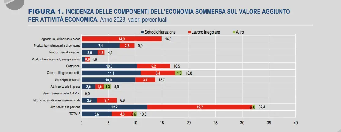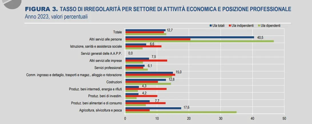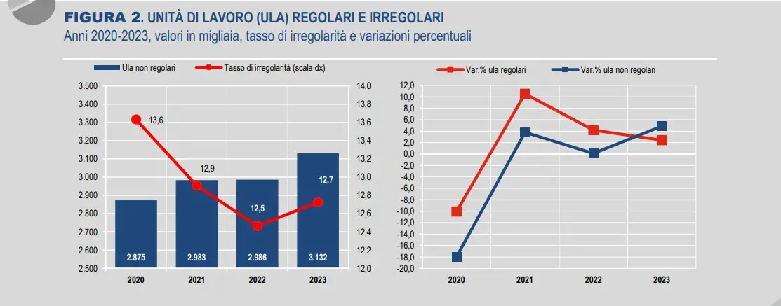 L’analisi dell’Istat si fonda sui numeri ed è precisa: “L’aumento del tasso di irregolarità è dovuto alla forte crescita del lavoro non regolare, la cui dinamica (+4,9%) è stata circa il doppio rispetto a quella dell’input di lavoro regolare. Quest’ultimo ha registrato nel 2023 un aumento del 2,4% (circa +503,5mila Ula), determinato prevalentemente dalla componente dei dipendenti (+3,1% Ula regolari pari a +464mila Ula). Il tasso di irregolarità si è confermato più elevato tra i dipendenti in confronto agli indipendenti (pari, rispettivamente, al 12,9% e al 12,2%); è proseguita, tuttavia, la tendenza all’attenuazione della differente incidenza del lavoro irregolare tra le due componenti, in atto dal 2018”.