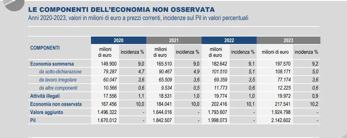 È l’Istat, come previsto dalle norme, che ogni anno in prossimità della legge di bilancio pubblica i dati sull’economia non osservata. Quelli di quest’anno sono inequivocabili. L’illegalità in economia è aumentata. Nel 2023, rispetto all’anno precedente l’economia non osservata passa a + 15,1 miliardi, pari al 7,5 per cento in più; l’economia sommersa (quella al netto delle attività illegali) arriva a 198 miliardi di euro, in crescita di 14,9 miliardi rispetto all’anno precedente, mentre le attività illegali sfiorano i 20 miliardi; le lavoratrici e i lavoratori irregolari sono 3 milioni 132 mila, in crescita di oltre 145 mila unità rispetto al 2022.