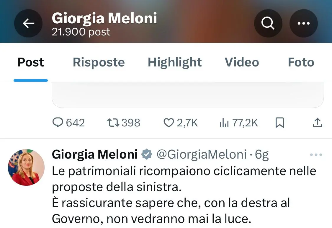 “Con la destra al governo le patrimoniali non vedranno mai la luce”. Più che un commento, quello di Giorgia Meloni su X è l’epitaffio della patrimoniale. E non ci si aspettava niente di diverso. Perché questa tassa aleggia su ogni discussione intorno alla legge di bilancio, senza prendere mai forma. Figuriamoci con questa maggioranza di destra.