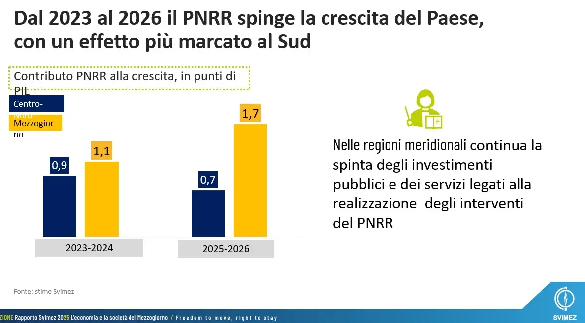 Almeno nel Sud del Paese la scommessa Pnrr sembra vinta, sempre che entro la scadenza si sia in regola con gli obiettivi da raggiungere. Lo afferma il Rapporto Svimez 2025. I dati analizzati sono a più facce. Da un lato le notizie positive, dall’altro i lati oscuri.