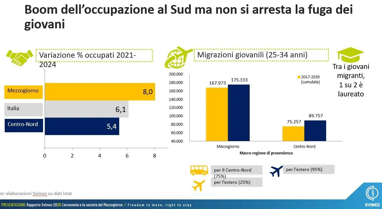 Il Rapporto evidenzia innanzitutto la fuga, che appare inarrestabile, di giovani: sempre tra il 2021 e il 2024 se ne sono andati in 175 mila, la metà dei quali laureati. Questa fuga ha due conseguenze negative, da un lato il territorio si impoverisce di competenze e talenti, dall’altro fa registrare una vera e propria perdita economica. Secondo lo Svimez infatti: “Le migrazioni dei laureati comportano per il Mezzogiorno una perdita secca di quasi 8 miliardi di euro l’anno”. Ed infatti, nonostante l’incremento dell’occupazione giovanile sia stato rilevante, + 6,4, è comunque assai più basso che al Centro-Nord, 51,3% contro 77,7%.
