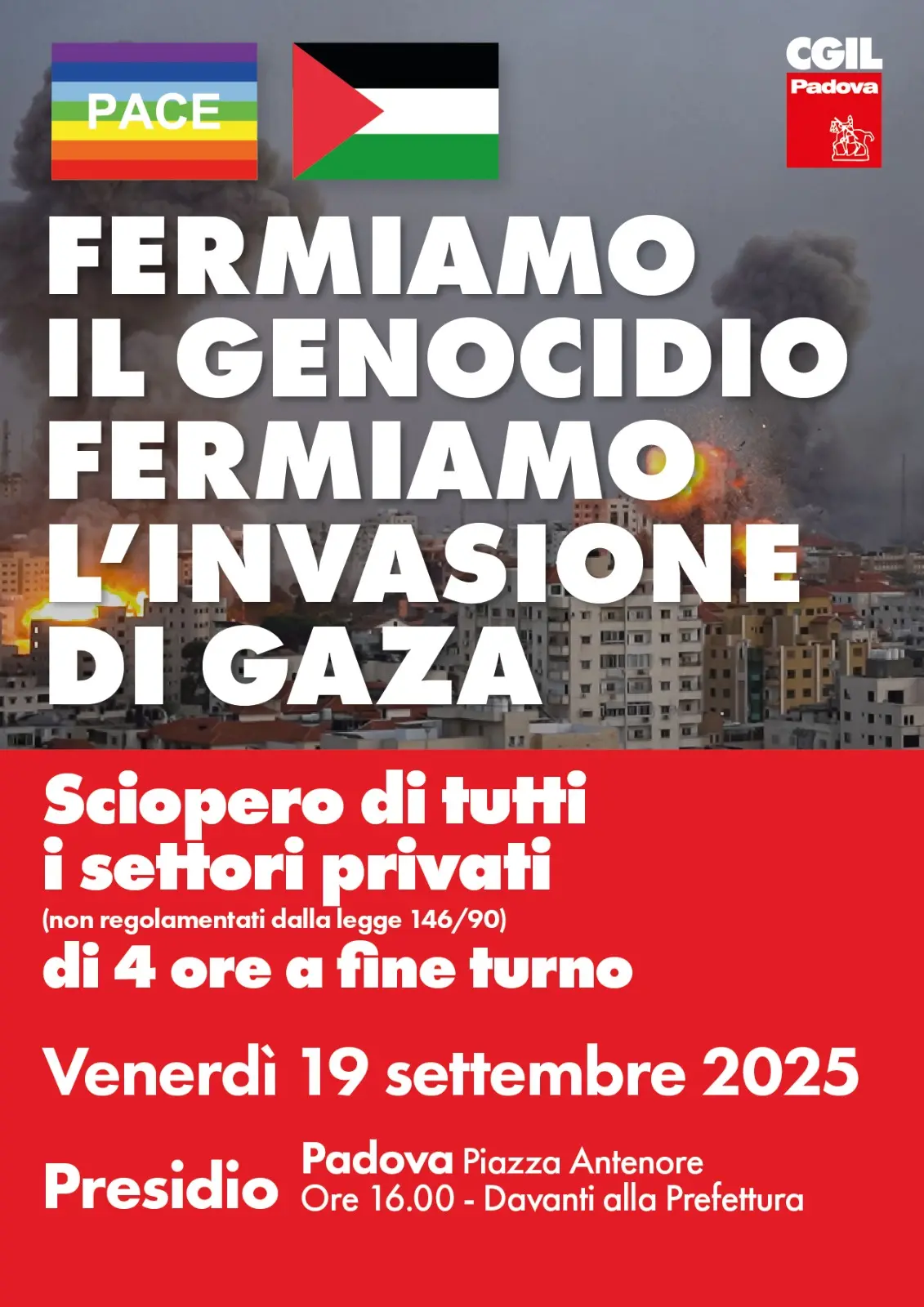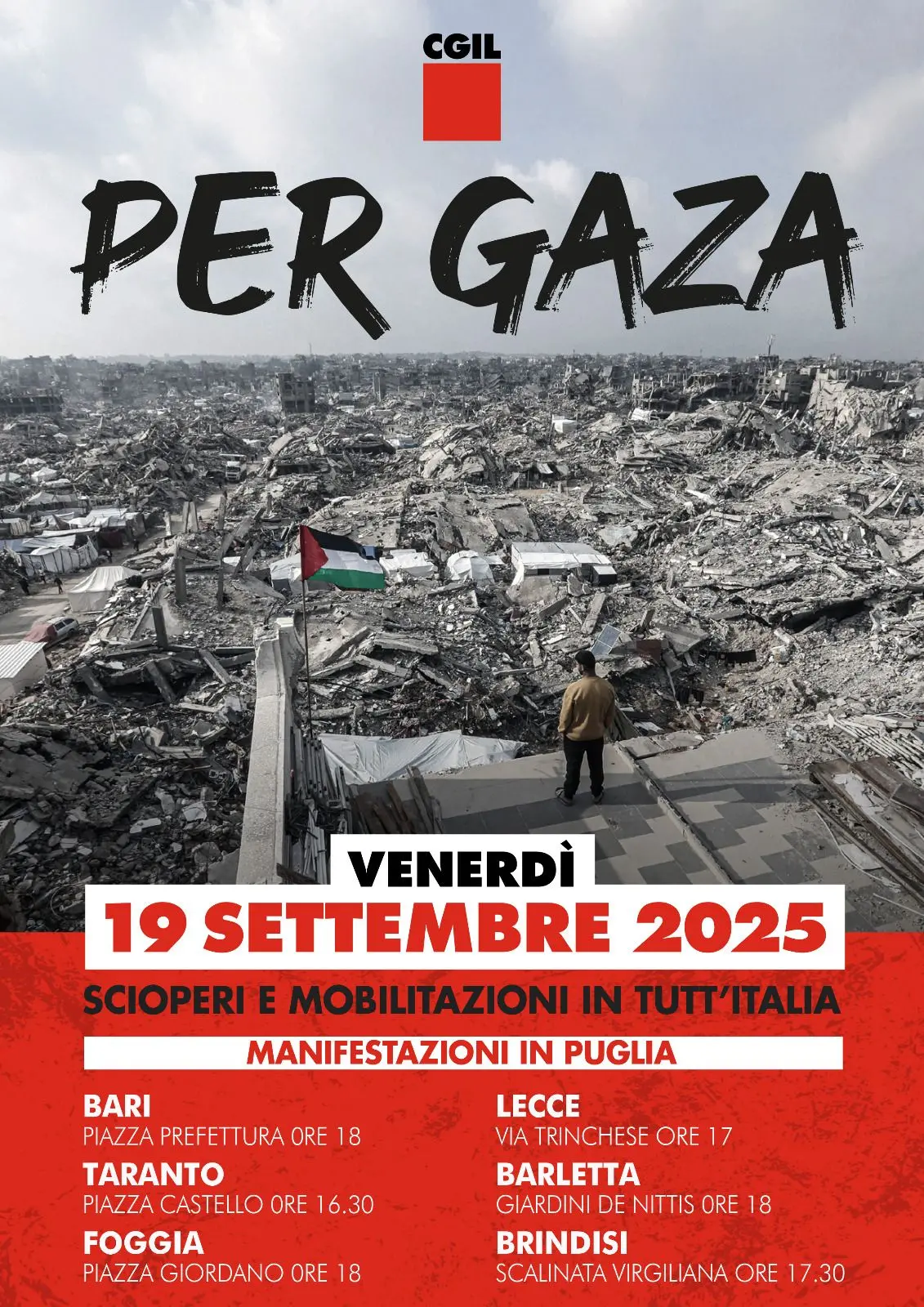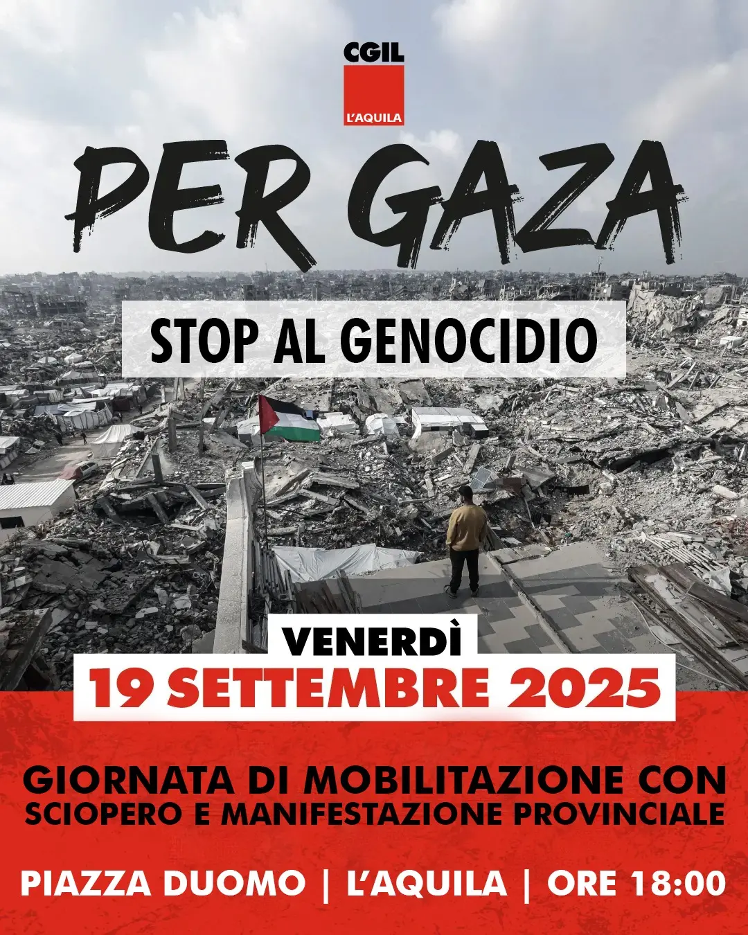 La Cgil di Roma e del Lazio proclama per il 19 settembre uno sciopero regionale di quattro ore, da effettuarsi a fine di ogni turno di lavoro, per tutte le lavoratrici e i lavoratori dei settori privati (a esclusione dei settori pubblici e privati soggetti agli obblighi della Legge n. 146/90). La mobilitazione nasce dall’urgenza di fermare l’invasione israeliana a Gaza⁴ e il genocidio del popolo palestinese.