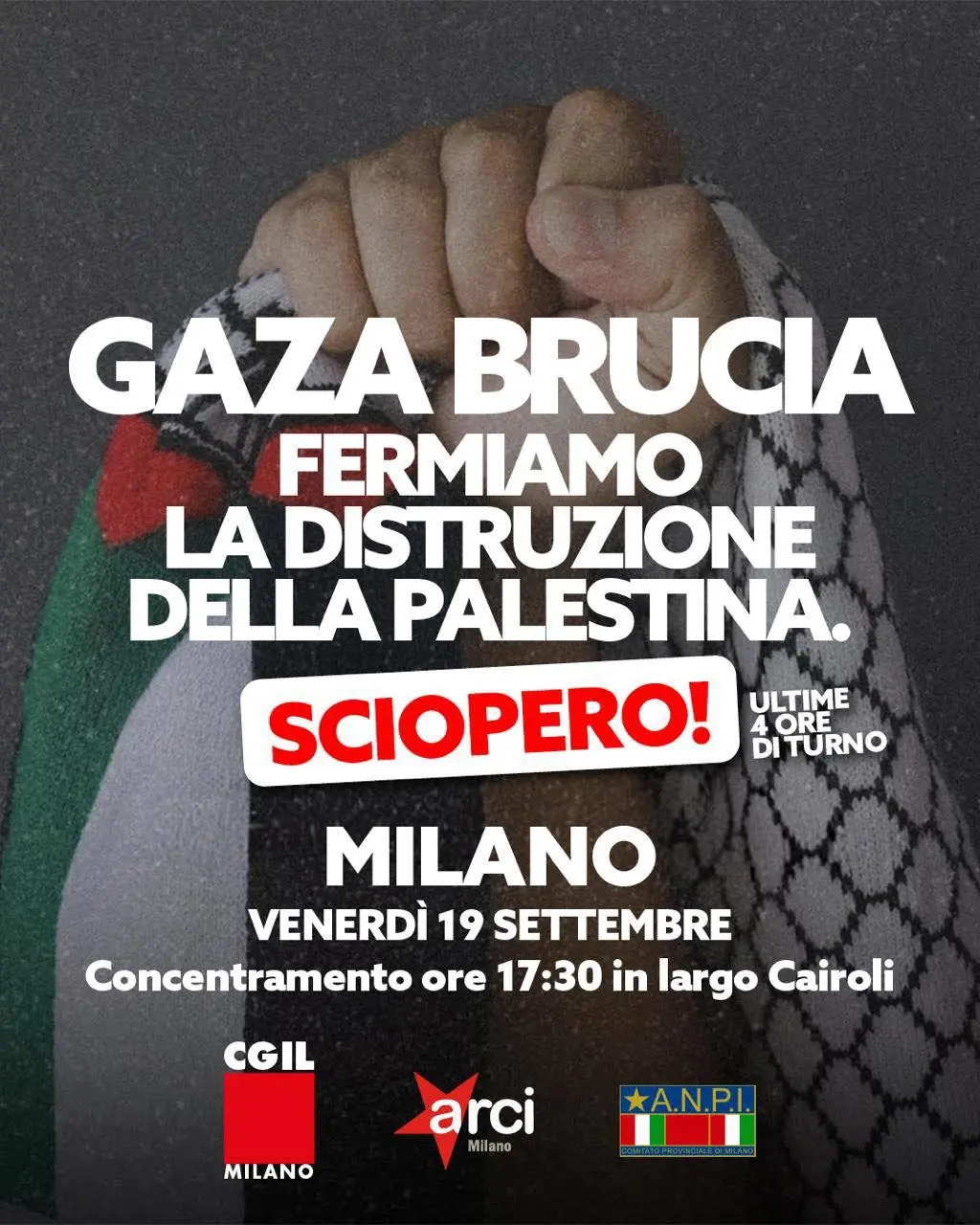 Fermiamo il genocidio. Venerdì 19 settembre manifestazione a Milano con partenza da Largo Cairoli. Cgil in sciopero