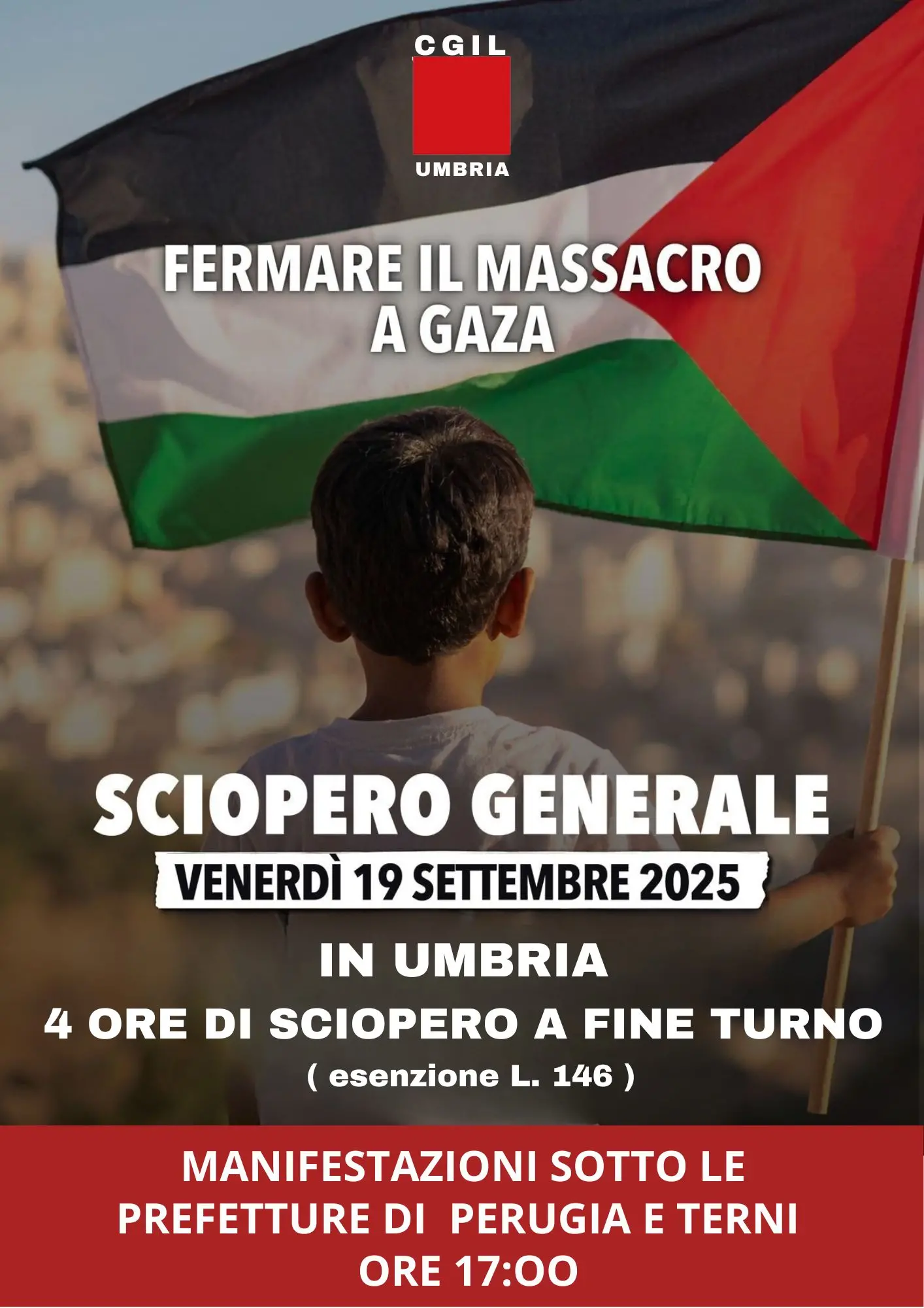 “Fermare il genocidio del popolo palestinese chiedendo la rottura di ogni rapporto con Israele, nessuna complicità dell’Italia e immediato riconoscimento dello Stato di Palestina”. Inizia così il post su Facebook con il quale la Cgil Umbria annuncia per venerdì 19 settembre lo sciopero generale con manifestazioni sotto alla Prefettura a Terni e a Perugia previste per le ore 17:00.