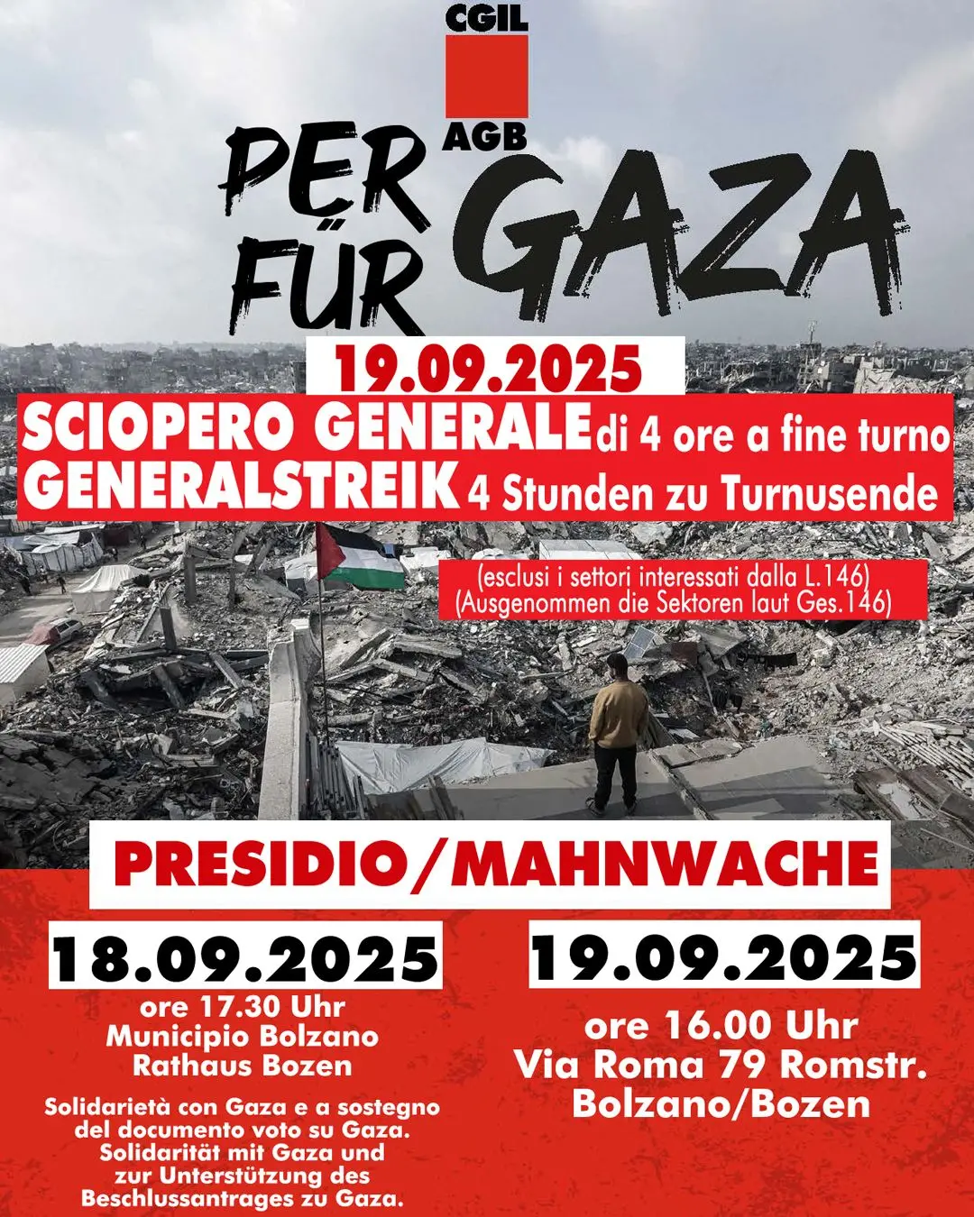 Nella giornata dello sciopero, venerdì 19 settembre, ci sarà un ulteriore presidio davanti alla sede della Cgil/Agb in via Roma 79 a Bolzano, a partire dalle ore 16.