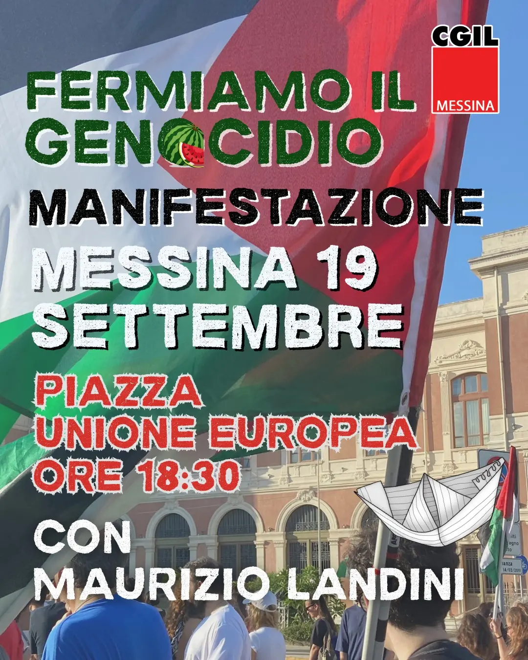 Venerdì 19 settembre sarà una giornata di mobilitazione generale nazionale per la Palestina indetta dalla Cgil. A Messina, alle 18:30 in piazza Unione Europea, con la partecipazione del segretario generale della Cgil Maurizio Landini, si terrà una manifestazione a sostegno del popolo palestinese, per riaffermare la giustizia, la pace, i diritti umani.