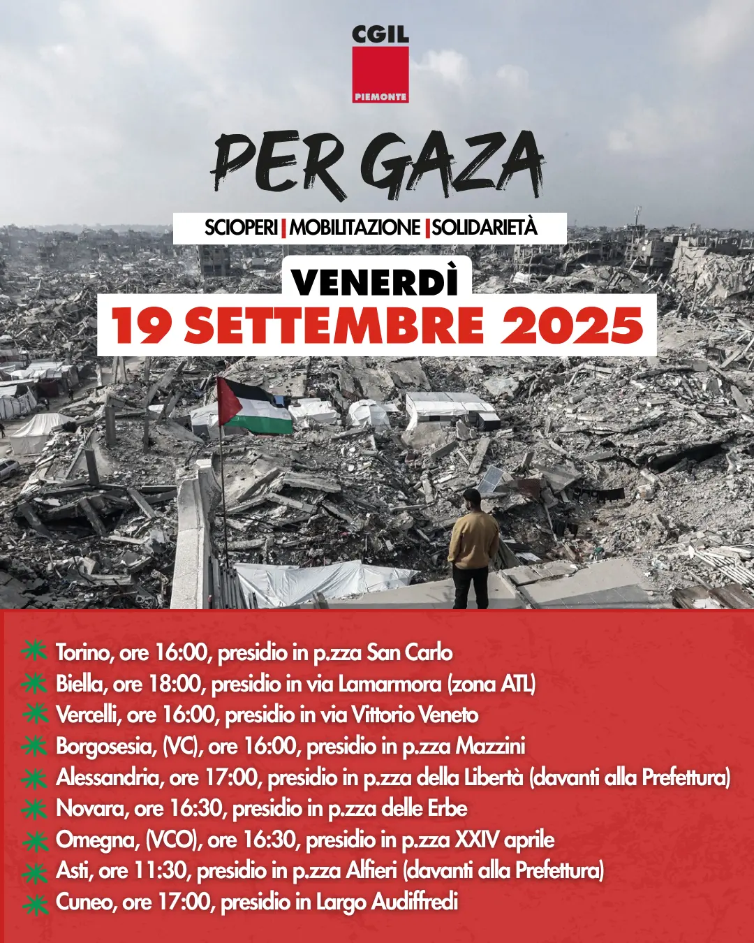 La Cgil dichiara sciopero per Gaza. Anche a Piacenza venerdì 19 settembre si terrà lo sciopero nelle ultime quattro ore di ogni turno di lavoro (esclusi i settori sottoposti alla L. 146/90) con presidio dalle ore 16:30 alle ore 18 di fronte al Palazzo del Governo, ossia la Prefettura di Piacenza, in piazzetta Tempio. Lavoratrici, lavoratori e tutta la cittadinanza sono invitati a partecipare.