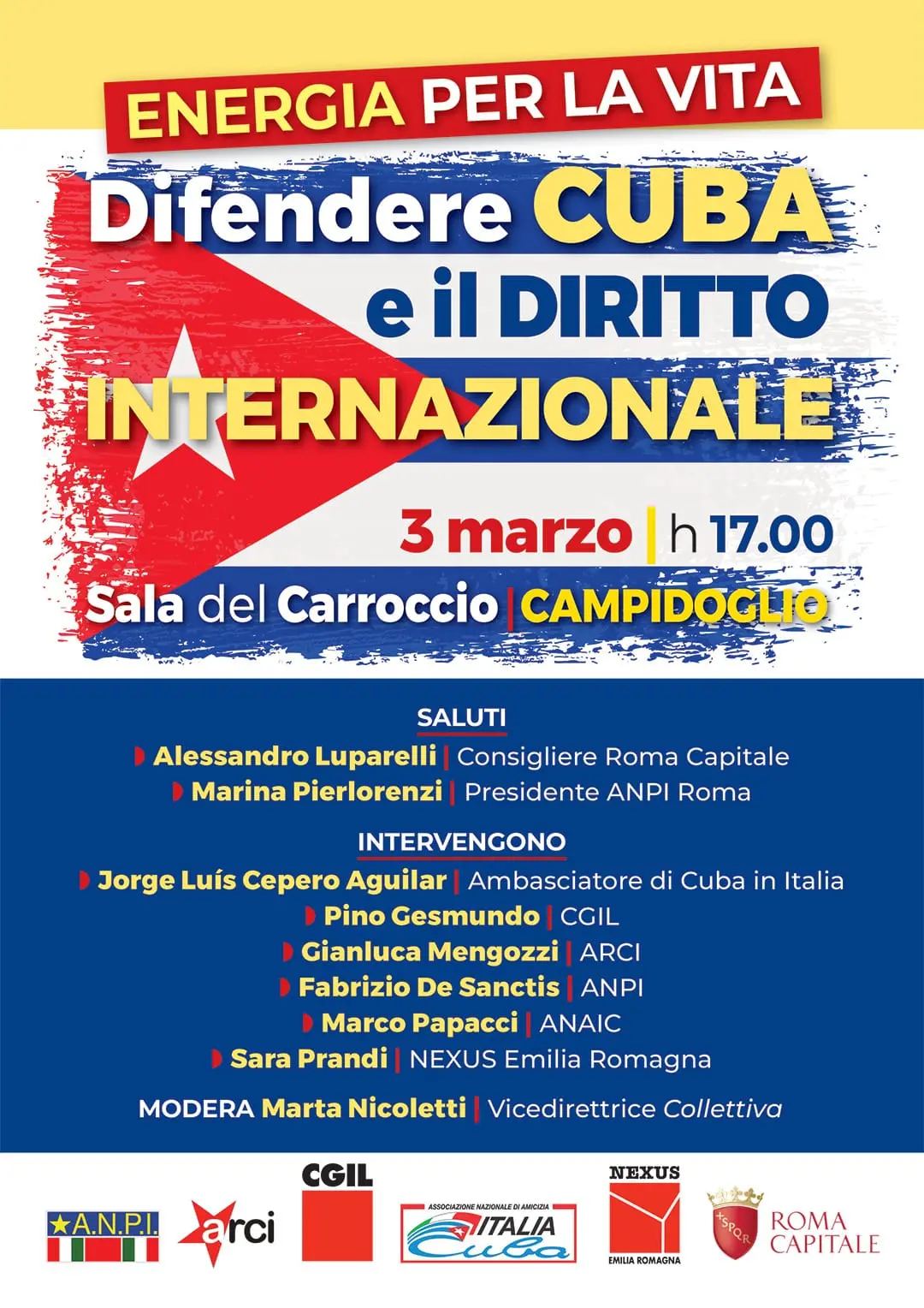 Martedì 3 marzo 2026, alle 17, in Campidoglio a Roma, si terrà l’incontro pubblico “Difendere Cuba e il diritto internazionale: la campagna Energia per la vita”, promosso da Cgil, Arci, Anpi, Associazione di amicizia Italia-Cuba e Nexus Emilia-Romagna.