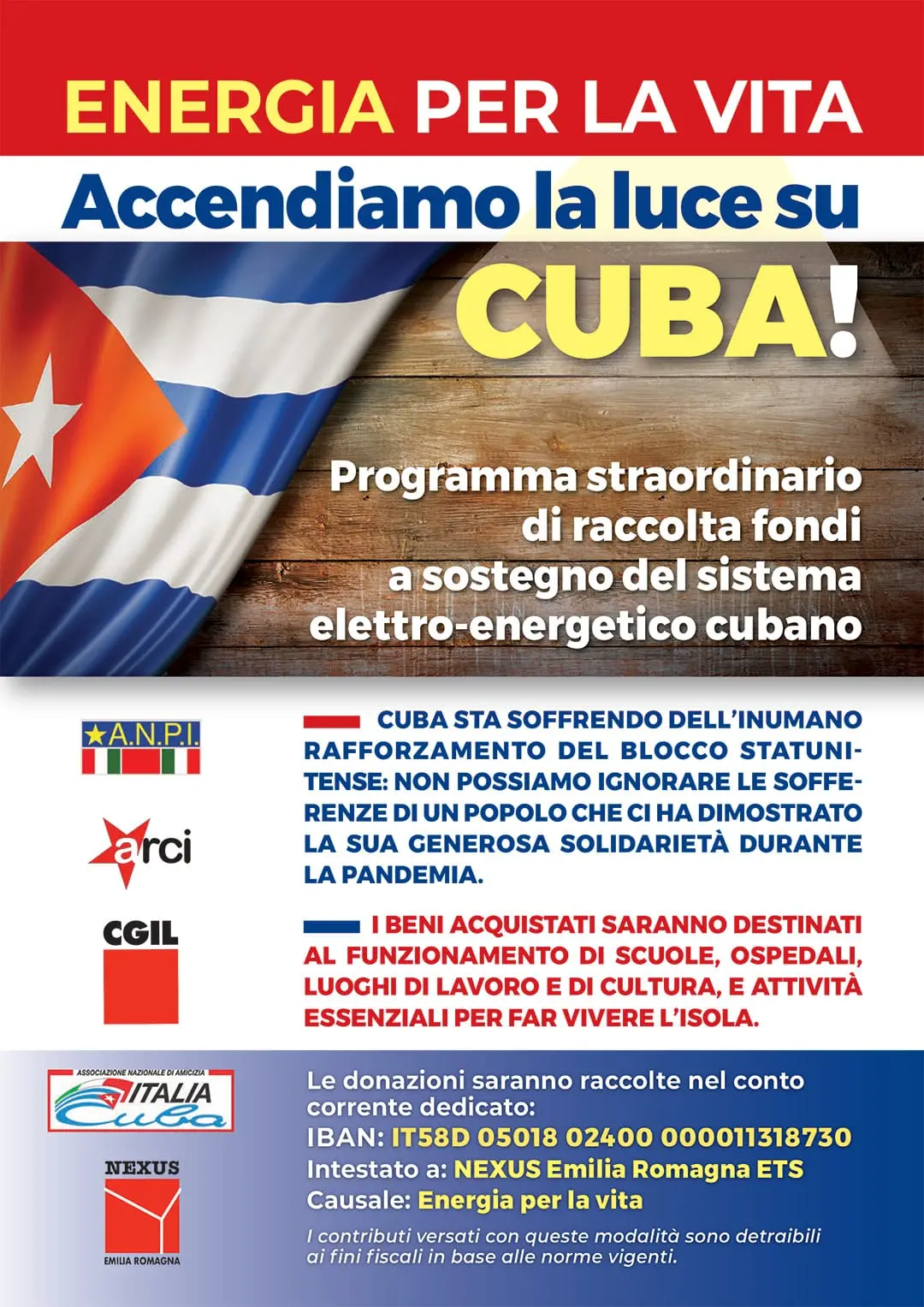 Presto mancherà energia per le attività essenziali, come ospedali, scuole, fabbriche di cibo e di medicinali. Il Paese sta morendo lentamente, e anche andare a lavorare, senza mezzi pubblici, è diventata un’impresa. Anche per tutto ciò la Cgil, insieme ad Anpi, Arci, Nexus e Italia Cuba, sta organizzando un’iniziativa per rilanciare la campagna “Energia per la vita” e portare all'attenzione le gravi difficoltà dell'isola, così che a breve partiranno i progetti nella parte orientale colpita dall’uragano Melissa.