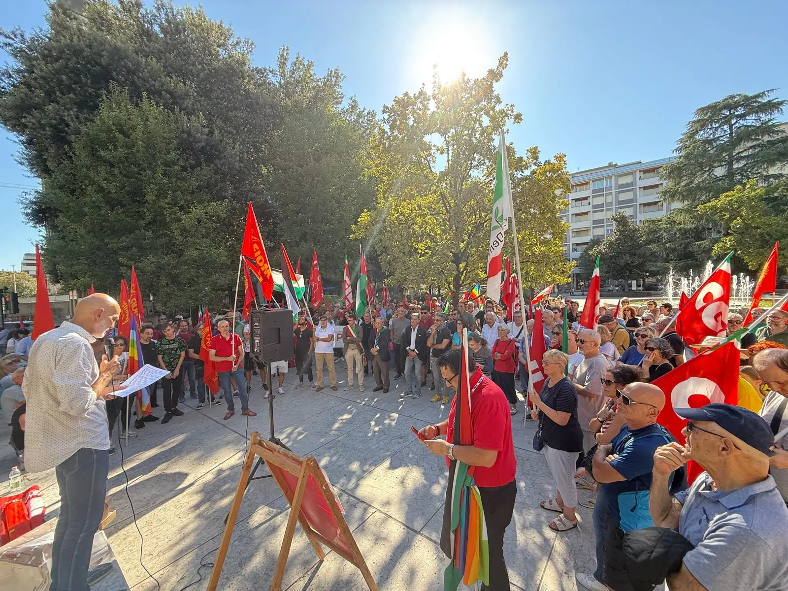 Tante le presenze in piazza del Gesù per la manifestazione regionale organizzata dalla Cgil a Napoli. Tra gli interventi quelli di Nicola Nardella, presidente dell’ottava Municipalità di Napoli, Gigi Cannavacciuolo di Libera Campania, Filippo Severino di Fari di Pace, Vincenzo Fiano del coordinamento Caserta per la Palestina, Vincenzo Landi dell’associazione studentesca Link UniSa, Gianluca Petruzzo de La Comune, Andrea Morniroli del Forum Diseguaglianze e Diversità, Davide Dioguardi, Insurgencia