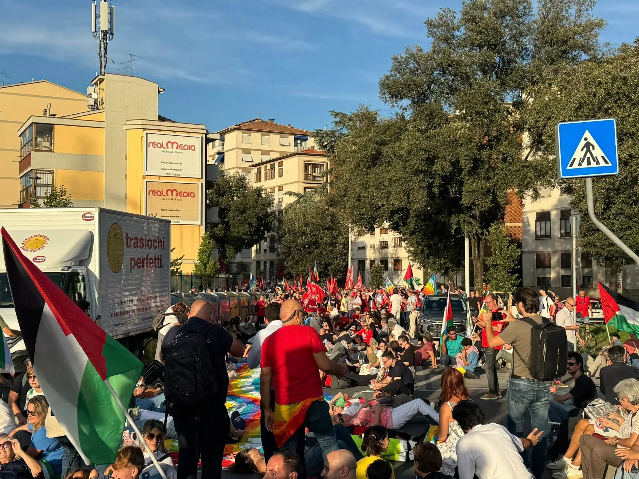 A Firenze oltre 20mila persone sono scese in piazza per Gaza in occasione dello sciopero generale Cgil in Toscana (esentati i settori dei servizi pubblici essenziali). Il corteo fiorentino, dove sono confluiti anche i territori di Prato e Pistoia, è partito da piazza Dalmazia per arrivare in piazza dell’Isolotto per i comizi finali. Durante il percorso, ci sono stati due flash mob (il primo, un die-in in via Mariti: i manifestanti si sono sdraiati a terra mentre dagli altoparlanti usciva il suono originale delle persone sotto le bombe a Gaza; nel secondo, al piazzale delle Cascine, sono state schierate le barchette di carta in sostegno della Global Sumud Flotilla), inoltre, è stato esposto uno striscione (con scritto “Stop accordi economici e militari con Israele subito”) su un ponte in zona piazza Puccini.