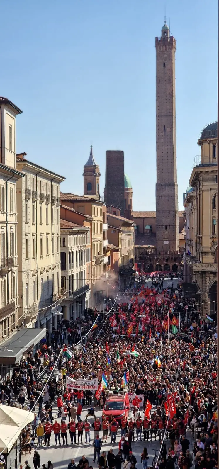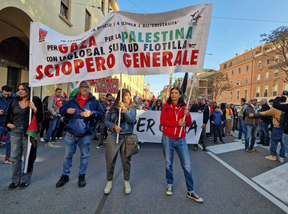 Sono decine di migliaia le persone che stanno aderendo a Bologna alla manifestazione per lo sciopero generale in difesa della Palestina e della Global Sumud Flotilla. Il corteo della Cgil, partito da piazza Malpighi poco prima delle 10, è ora arrivato in piazza Maggiore con almeno 20 mila partecipanti che si uniscono alle decine di migliaia di manifestanti del corteo dei sindacati di base e degli studenti che affollano via Ugo Bassi e via Rizzoli. I due spezzoni della manifestazione si sono riuniti in un unico corteo. “La città non è mai stata così piena di persone in piazza”, afferma il segretario generale Cgil Bologna Michele Bulgarelli: “Siamo maggioranza nel Paese, il governo ne prenda atto”.