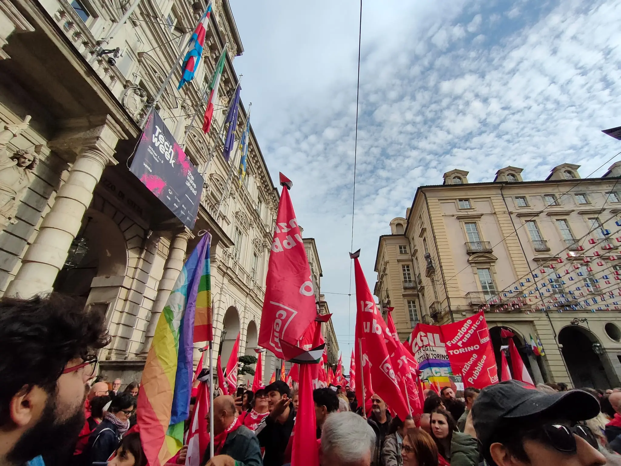 Sono cinquantamila le persone in piazza a Torino che partecipano al corteo, partito da piazza Palazzo di Città, davanti al Municipio, ribattezzata da qualche giorno piazza Gaza promosso da Cgil, Usb e Cub a sostegno del popolo palestinese e della Flotilla. Alla manifestazione lavoratori, studenti, famiglie con bambini che questa mattina poco dopo le 10 stanno sfilando per le vie del capoluogo piemontese. E' una manifestazione enorme non solo di giovani, ma anche di tante lavoratrici e tanti lavoratori. Questo è il valore aggiunto dello sciopero di oggi'', ha osservato il segretario torinese della Cgil, Federico Bellono.