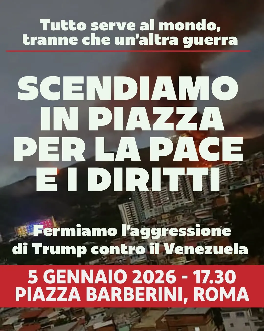 Per queste ragioni è stato convocato un presidio pubblico lunedì 5 gennaio alle 17.30 a Roma, in piazza Barberini. Un appuntamento aperto a cittadine e cittadini, associazioni e realtà della società civile, chiamati a “alzare la voce” e a mobilitarsi contro l’ennesimo arbitrio dei potenti. Tra le prime adesioni figurano Anpi Comitato provinciale di Roma, Cgil Roma e Lazio, Rete Italiana Pace e Disarmo, Sbilanciamoci, Stop Rearm Europe Italia e altre reti associative impegnate per la pace e i diritti.