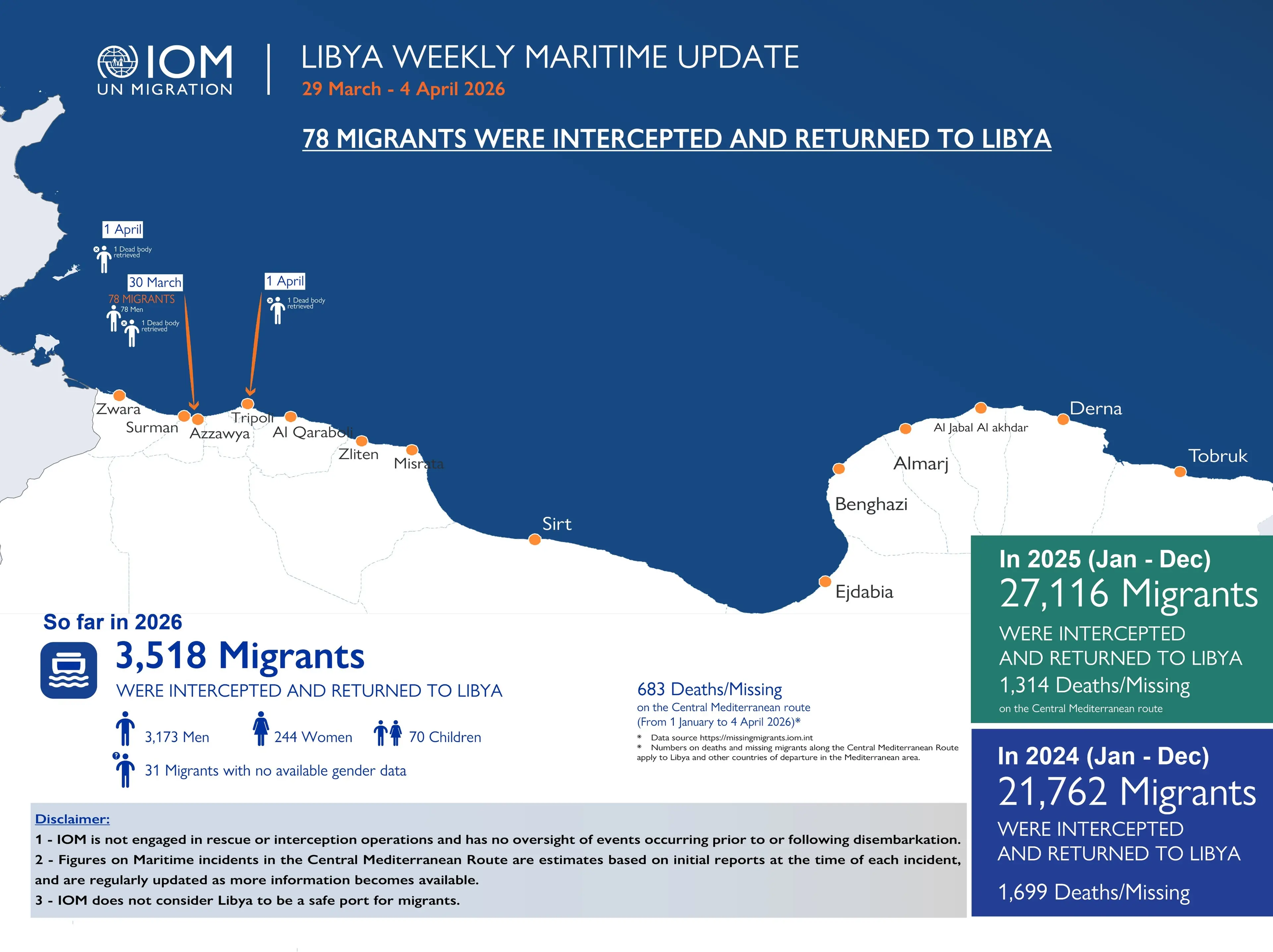 Parallelamente all’aumento delle vittime, cresce anche il numero delle intercettazioni in mare e dei respingimenti verso la Libia. Altri dati dell’Oim mostrano una continuità impressionante: tra inizio e fine marzo, e nei primi giorni di aprile, centinaia di persone sono state intercettate e riportate indietro nel giro di pochi giorni. 78 tra il 29 marzo e il 4 aprile, 190 tra il 22 e il 28 marzo 2026, addirittura 507durante la settimana precedente. Più di 3.500 da inizio anno.