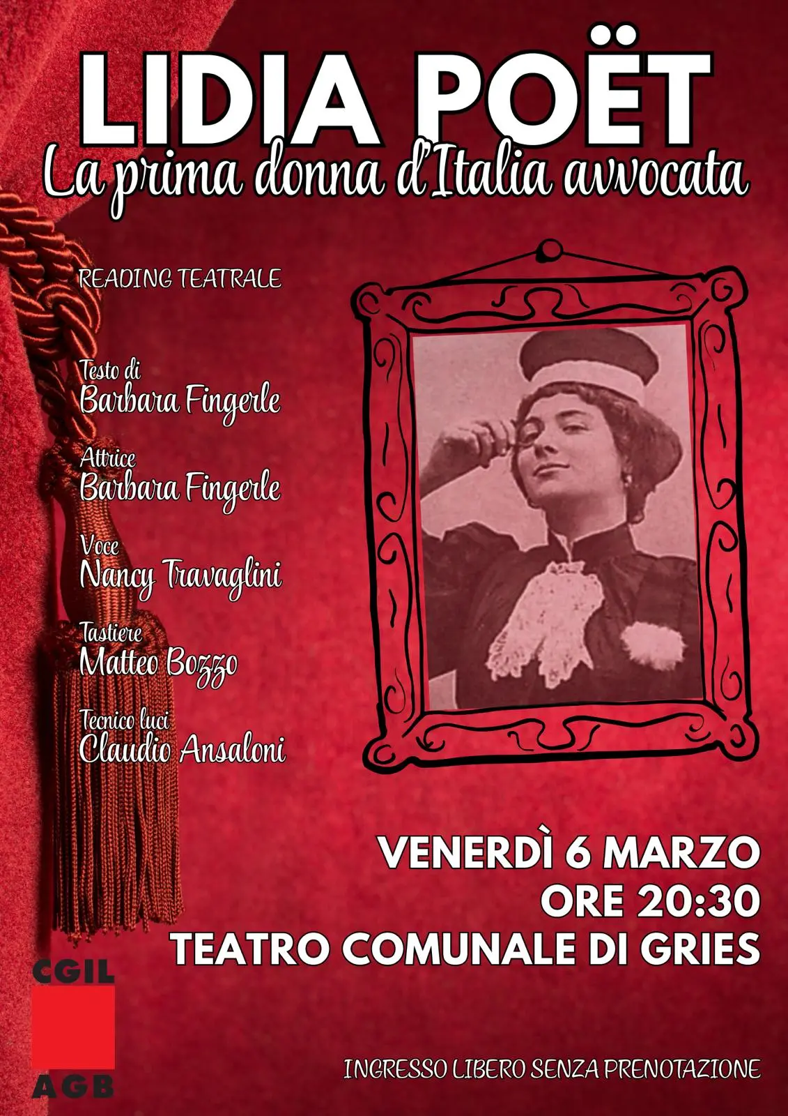 In occasione della Giornata Internazionale della Donna, la Cgil/Agb promuove il reading teatrale “Lidia Pöet. La prima donna d’Italia avvocata”, di Barbara Fingerle, venerdì 6 marzo alle ore 20.30 al Teatro comunale di Gries. Ingresso libero, senza prenotazione.
