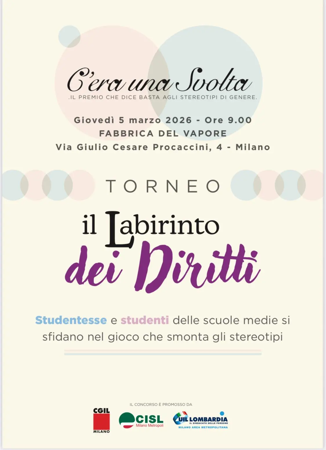 Giovedì 5 marzo, dalle ore 9.00, alla Fabbrica del Vapore si terrà l’edizione 2026 del premio “C’era una Svolta”, promosso da Cgil Cisl Uil milanesi e giunto alla quarta edizione.