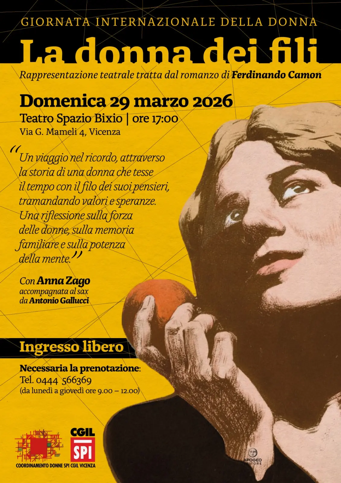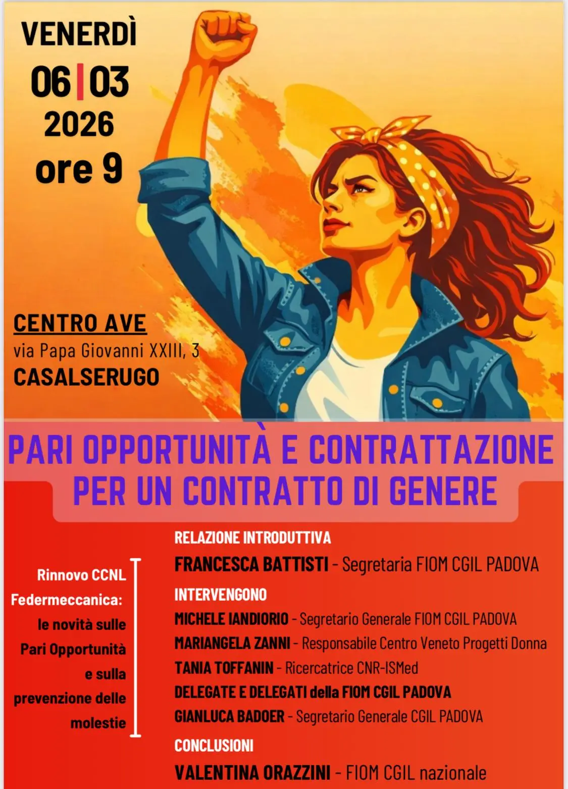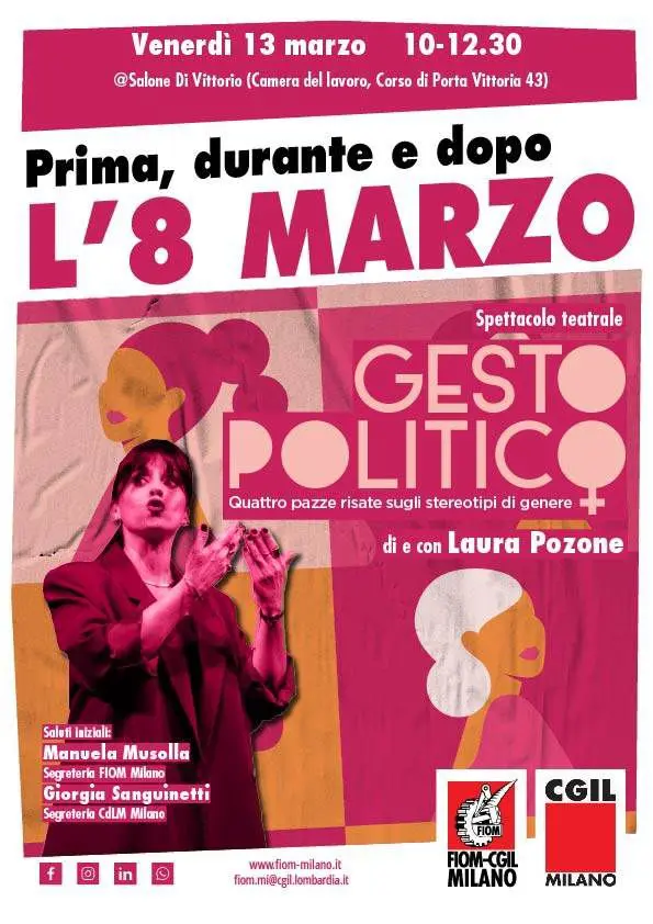Al centro della mattinata lo spettacolo teatrale “Gesto Politico – Quattro pazze risate sugli stereotipi di genere”, di e con Laura Pozone. Attraverso l’ironia e il linguaggio teatrale, lo spettacolo affronta con intelligenza e leggerezza i pregiudizi che ancora condizionano la vita delle donne. Intervengono Giorgia Sanguinetti per la Camera del Lavoro e Manuela Musolla per Fiom.