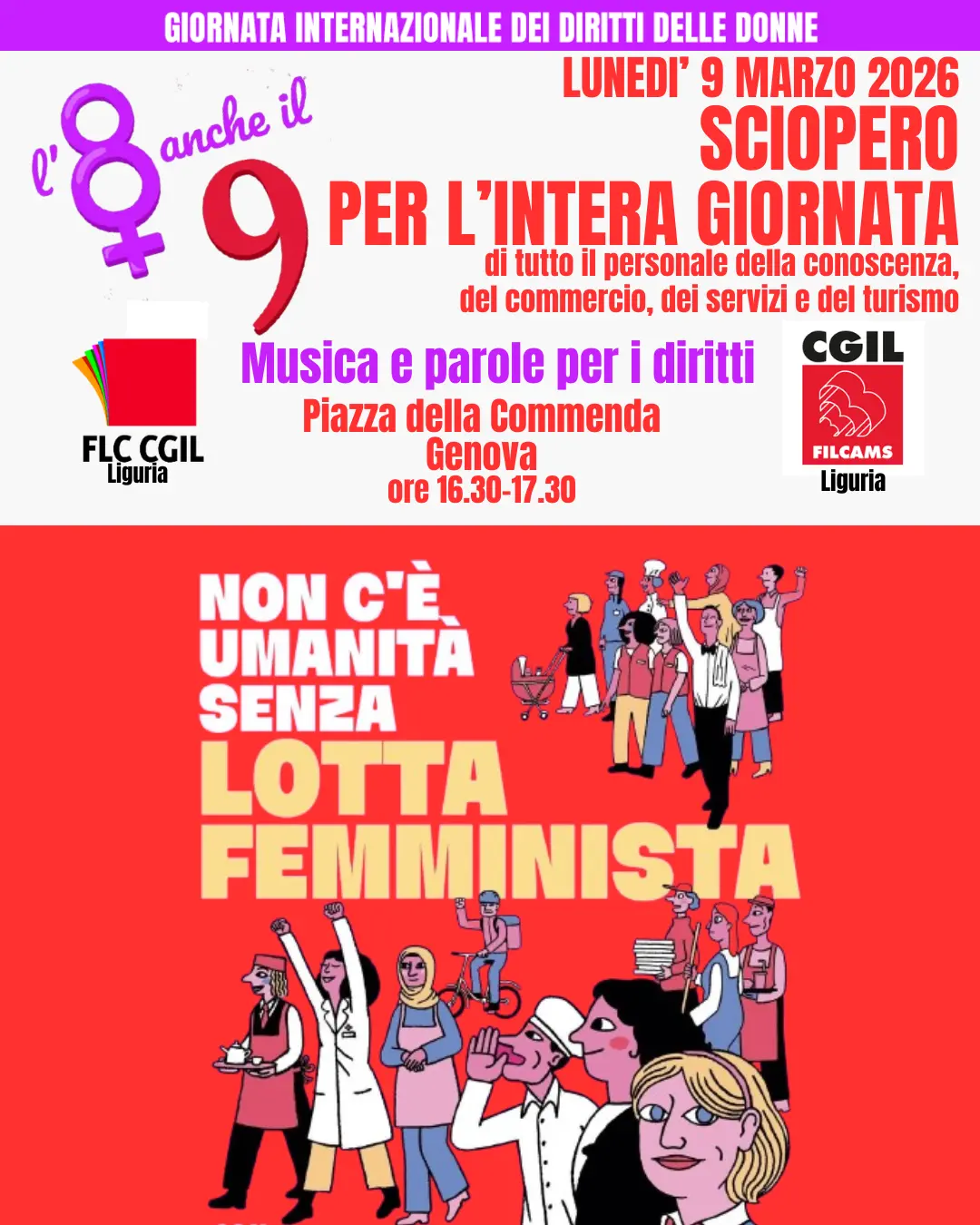 Sempre venerdì 6 marzo, la Fp Cgil Genova alle ore 14 invita tutte e tutti al Teatro di Strada Nuova, via Boccanegra, ad assistere allo spettacolo: “I diritti dell’8 marzo cominciano dallo zero – sei”.