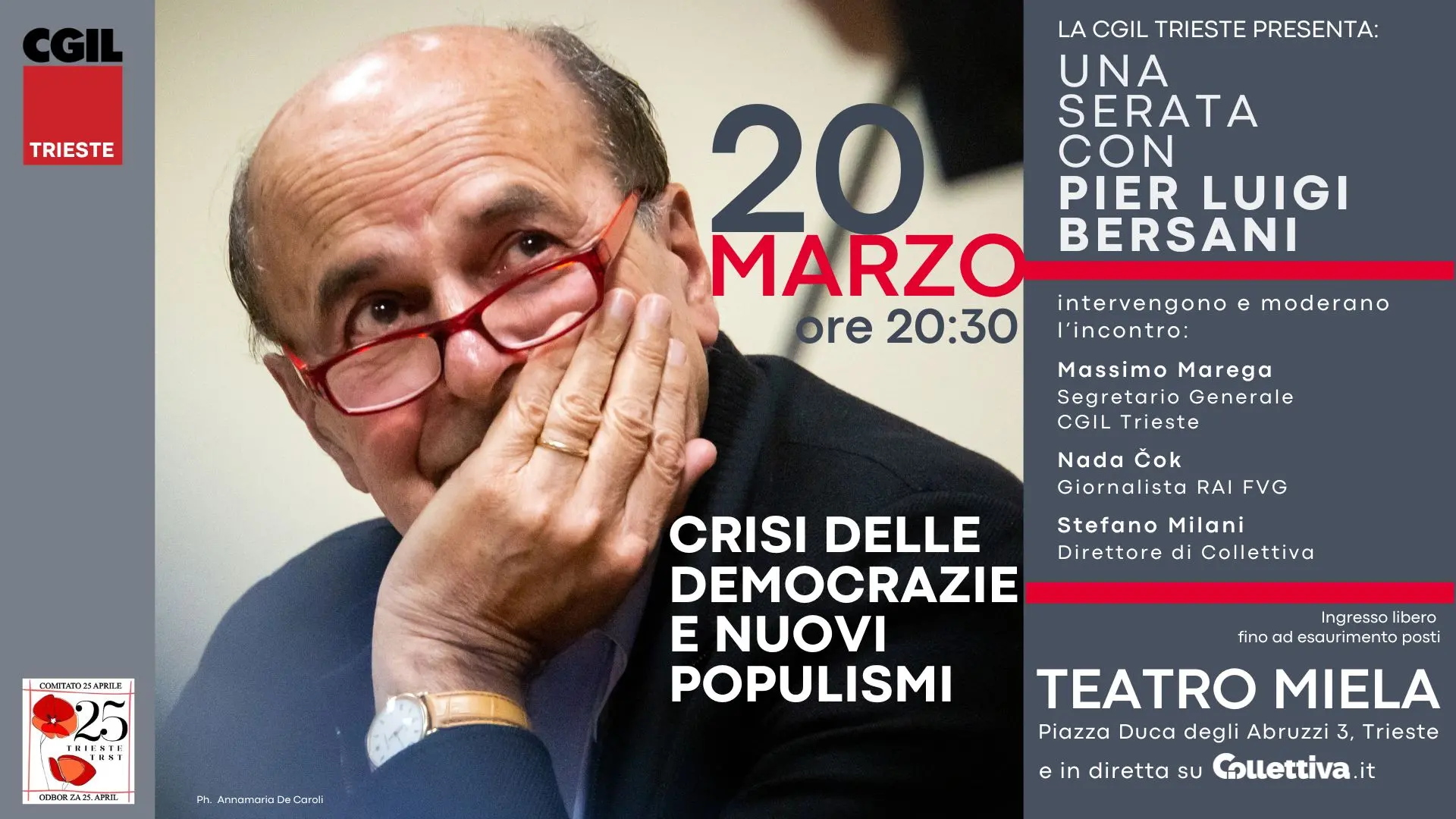 In diretta giovedì 20 marzo alle 20:30 dal teatro Miela di Trieste, l’appuntamento promosso dalla Cgil locale dal titolo “Crisi delle democrazie e nuovi populismi”. Protagonista della serata Pierluigi Bersani che risponderà alle domande di Nada Čok, giornalista di Rai Fvg, e di Stefano Milani, direttore di Collettiva.