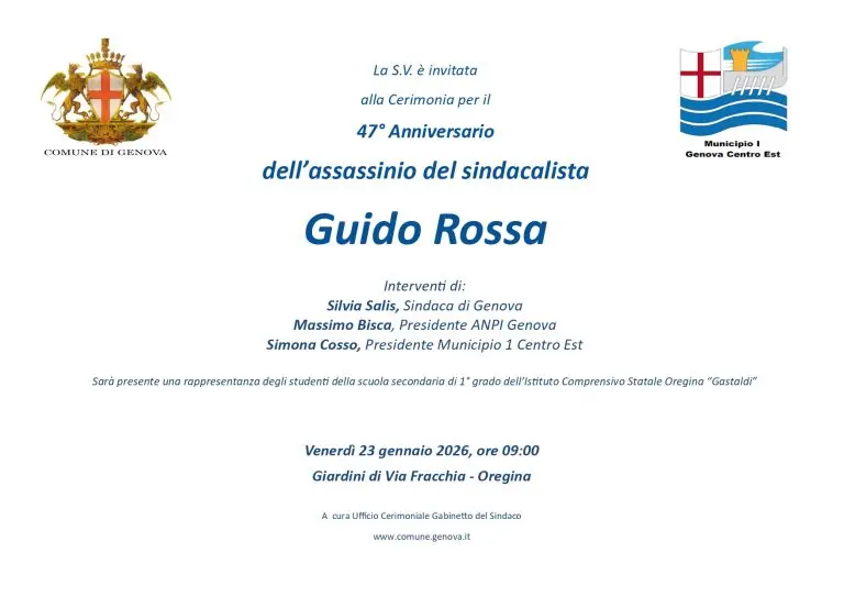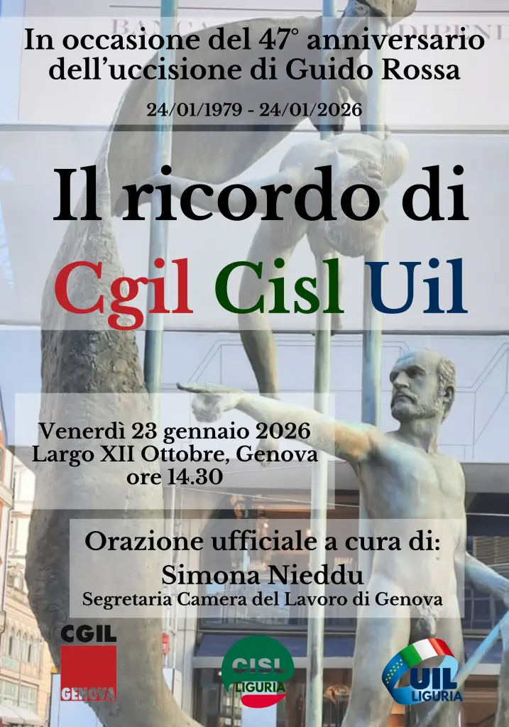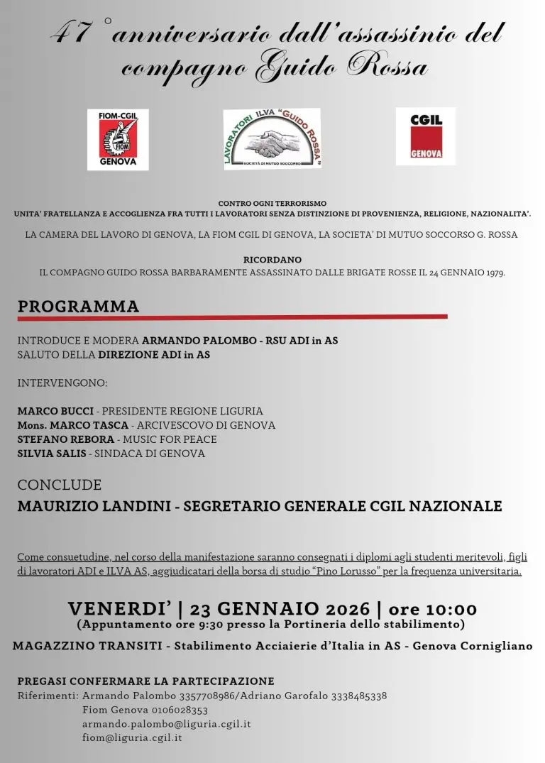 Alle ore 12.00, Via San Giovanni d’Acri 6, Casa del Sindacato, commemorazione a cura della Camera del Lavoro di Genova in ricordo di Guido Rossa, operaio e sindacalista, assassinato nel 1979 per mano delle Brigate Rosse. La cerimonia si svolgerà presso il monumento a lui dedicato. Un momento di raccoglimento e riflessione per ricordare una figura che ha pagato con la vita la scelta di difendere i valori della libertà, del lavoro e della democrazia. All’iniziativa interverrà anche il segretario generale della Cgil, Maurizio Landini, insieme a Vanda Valettini, funzionaria della Camera del Lavoro di Genova e Massimo Bisca, presidente Anpi Genova.