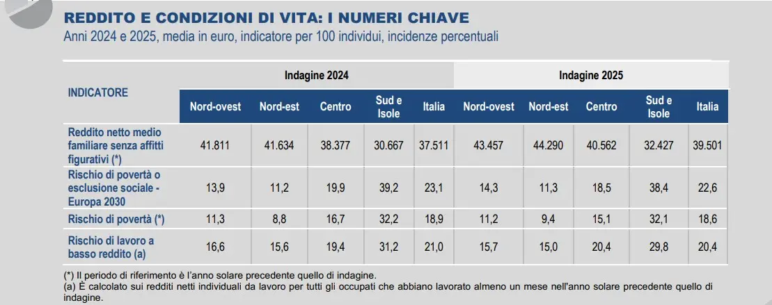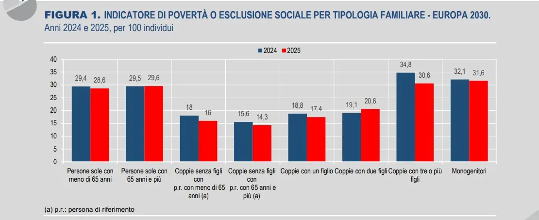 Il rischio povertà o grave deprivazione aumenta se in famiglia c’è uno straniero e di molto: nel 2025 l’indice si attesta al 41,5% mentre nel 2024 era del 37,5%. Ancora, uno degli obiettivi del Pnrr era quello di ridurre i divari territoriali; ebbene il Nord-est si conferma la ripartizione con la minore incidenza di rischio di povertà o esclusione sociale (11,3%, era 11,2% nel 2024), mentre il Mezzogiorno quella con la più alta (38,4%, era 39,2% nel 2024).