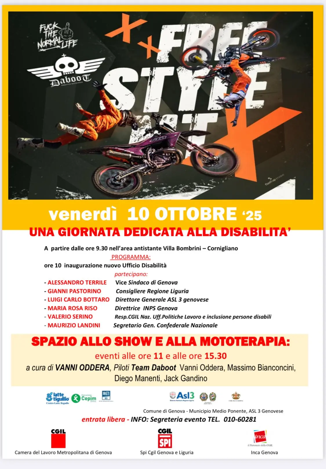 In occasione dell’inaugurazione dell’Ufficio disabilità in Camera del Lavoro in Via San Giovanni d’Acri 6 a Genova Cornigliano, previsto per le ore 10 di venerdì 10 ottobre, la Cgil si apre al quartiere e alla città e ospita due spettacoli di freestyle su due ruote e moto terapia con il grande Vanni Oddera e i piloti del Team Daboot. La giornata è interamente dedicata alle disabilità e all’inclusione ed è organizzata dalla Camera del Lavoro di Genova, dallo Spi Cgil Genova e dal Patronato Inca. Ci sarà anche il segretaria generale della Cgil, Maurizio Landini.