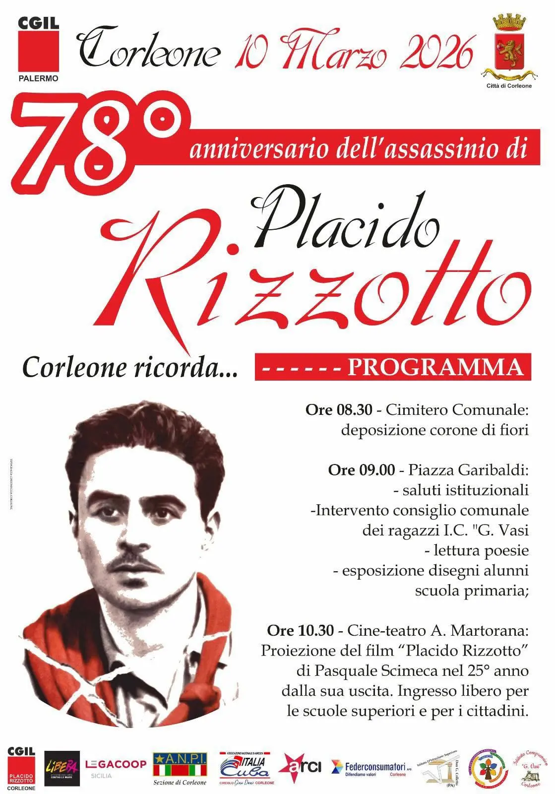 Il 10 marzo del 1948 veniva ucciso dalla mafia il segretario della Camera del Lavoro di Corleone, Placido Rizzotto. Domani, 10 marzo, la Cgil lo ricorda con una serie di iniziative in collaborazione con le scuole corleonesi, Libera, Legacoop, Anpi, Arci, Associazione Italia-Cuba e Federconsumatori.