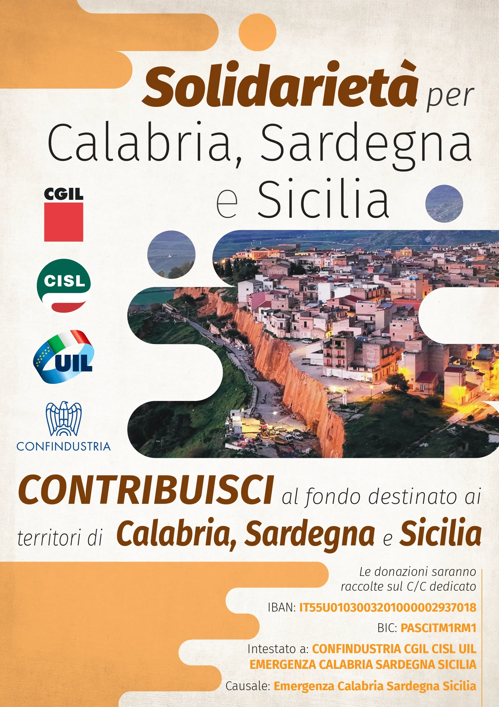 Per l’occasione Confindustria, Cgil, Cisl e Uil hanno sottoscritto un accordo di solidarietà e aperto un conto corrente dedicato, codice Iban IT55U0103003201000002937018, Monte dei Paschi di Siena, intestato a CONFINDUSTRIA CGIL CISL UIL EMERGENZA CICLONE HARRY, causale “Emergenza Calabria Sardegna Sicilia”.