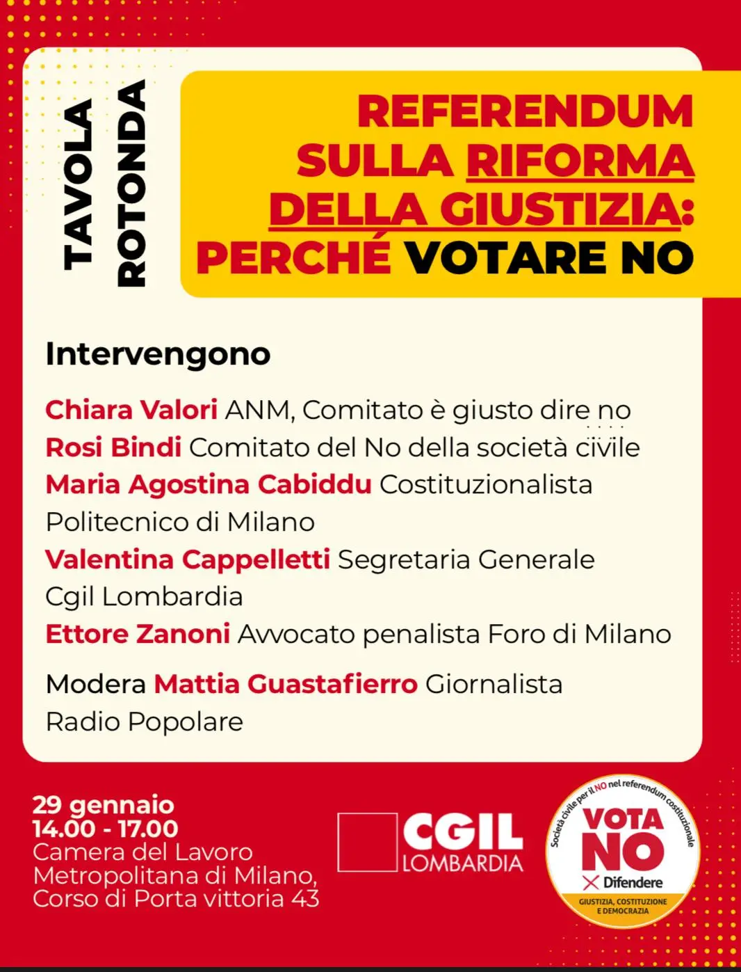 E intanto giovedì 29 gennaio, dalle ore 14.00 alle 17.00, alla Camera del Lavoro Metropolitana di Milano (Corso di Porta Vittoria 43) si terrà la tavola rotonda “Referendum sulla riforma della giustizia: perché votare No”, promossa da Cgil Lombardia.