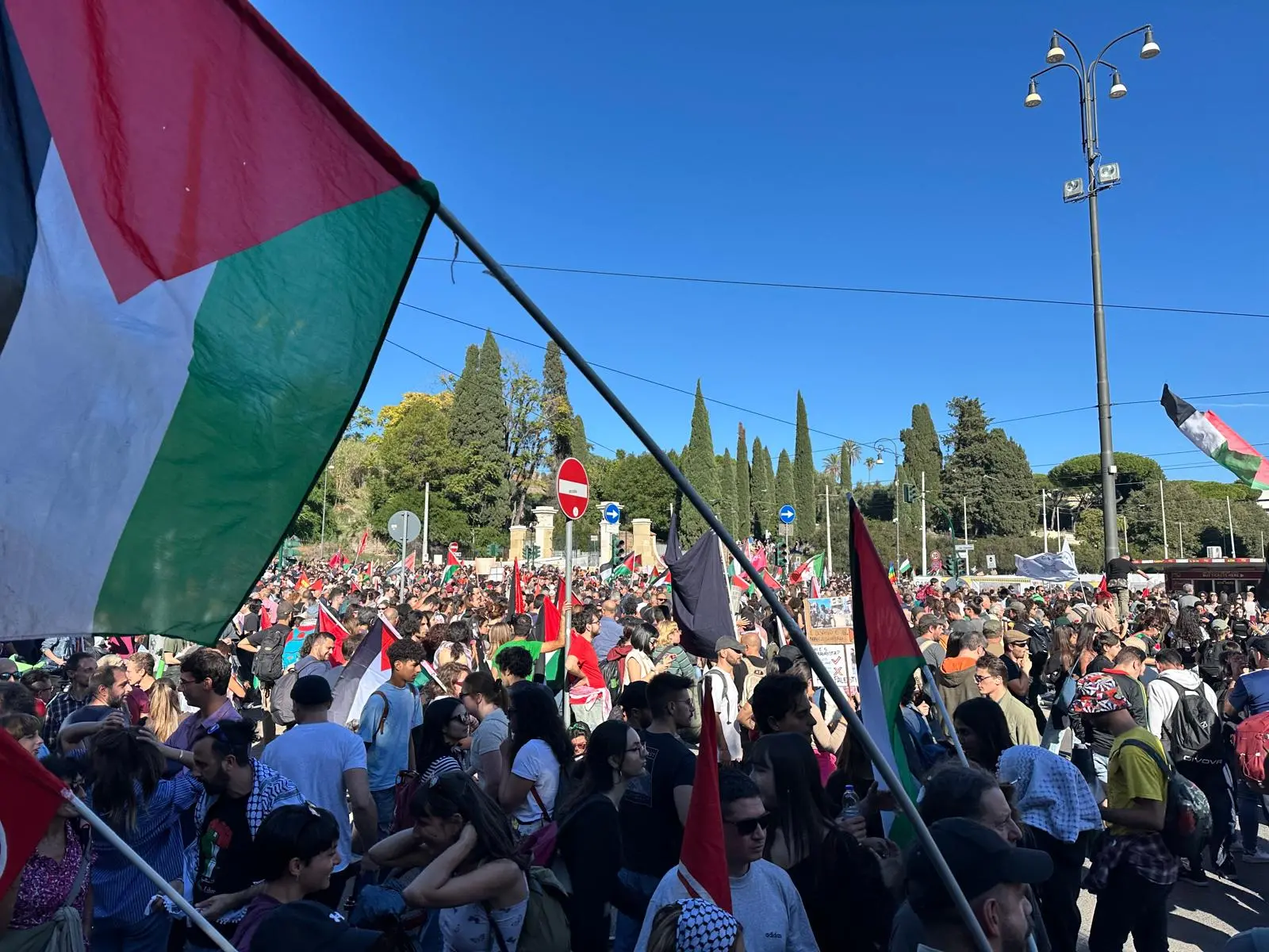 La partecipazione è stata tale che, una volta partito il corteo, molte persone erano ancora nei pressi della Piramide. Poi un serpentone umano si è dislocato lungo il percorso. In testa le bandiere della Palestina con lo striscione dell'Api (Associazione dei palestinesi in Italia), organizzatrice dell'evento, che recita: “Stop complicità con Israele. Contro occupazione e genocidio, con la resistenza palestinese”.