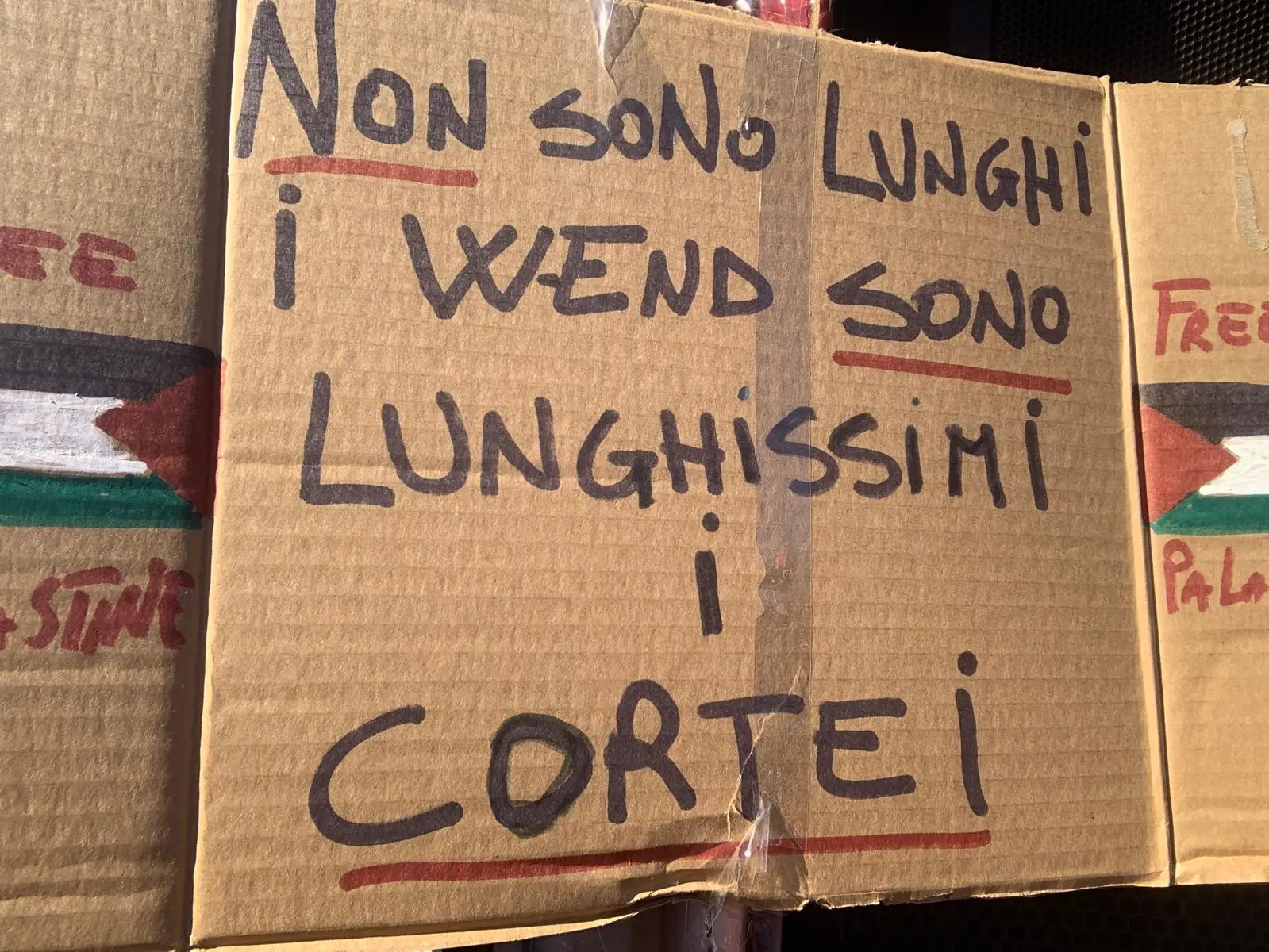 Tanti i cori che si sono levati dal corteo, anche a sostegno della Flotilla che è stata fermata illegalmente dalle autorità israeliane mentre si avvicinava a Gaza. Persone di ogni età hanno alzato le mani facendo il segno della pace con le dita, scandendo cori per la Palestina e per il coraggio della Flotilla. “Siamo tutti palestinesi”, questo il ritornello.