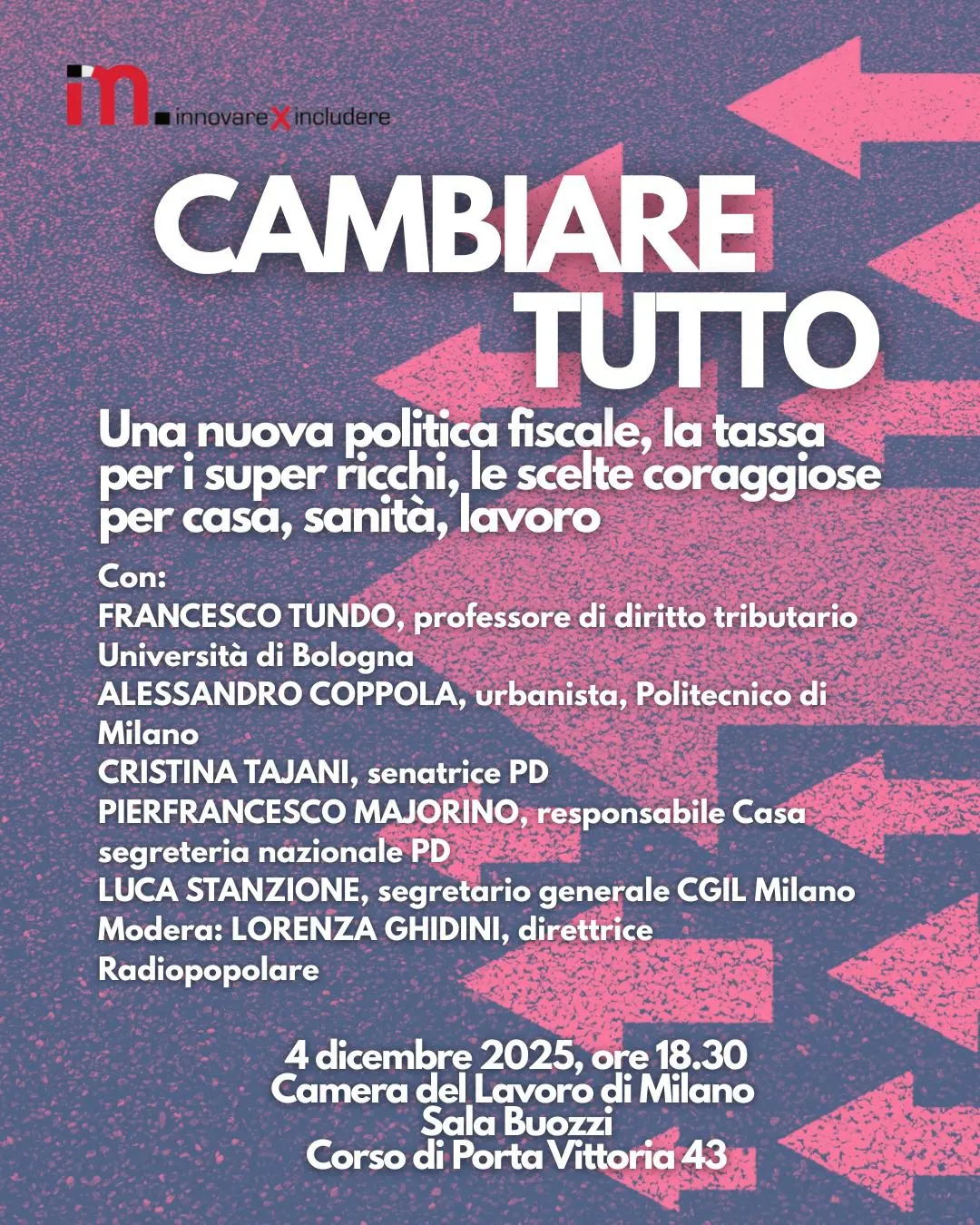 Di tutti questi temi, già al centro dello sciopero generale che la Cgil ha proclamato per venerdì 12 dicembre, si parlerà all’iniziativa “Cambiare Tutto”, organizzata dall’associazione InnovareXIncludere, giovedì 4 dicembre alle 18.30. Partecipano il segretario generale Cgil Luca Stanzione, la senatrice Pd Cristina Tajani, il responsabile nazionale delle politiche abitative de Pd, Pierfrancesco Majorino, i docenti Alessandro Coppola e Francesco Tundo. Modera la direttrice di Radiopopolare Lorenza Ghidini.