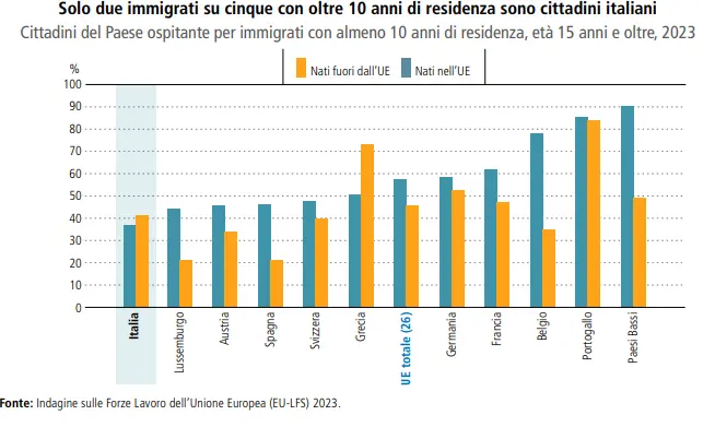 Particolarmente critico è il nodo della cittadinanza. Solo il 40% degli immigrati con almeno dieci anni di residenza ha ottenuto la cittadinanza italiana. Tra i giovani 15-34 anni nati in Italia da genitori stranieri, quasi due su cinque non sono cittadini italiani. Nel 2023, appena il 38% dei giovani nati all’estero e arrivati prima dei 15 anni possedeva la cittadinanza. Le regole restrittive di naturalizzazione continuano quindi a ritardare l’inclusione civica di lungo periodo.