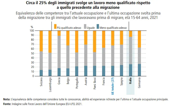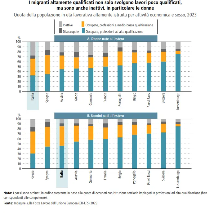 Eppure, l’integrazione nel mercato del lavoro appare ambivalente. Se da un lato i tassi di occupazione sono relativamente elevati, dall’altro i rendimenti dell’istruzione sono limitati e le competenze spesso sottoutilizzate, soprattutto tra le donne. Un immigrato su quattro svolge un lavoro meno qualificato rispetto a quello esercitato prima della migrazione. Tra i cittadini non Ue con titolo di studio elevato, il tasso di occupazione è del 69%, inferiore a quello osservato in molti altri Paesi europei Ocse.
