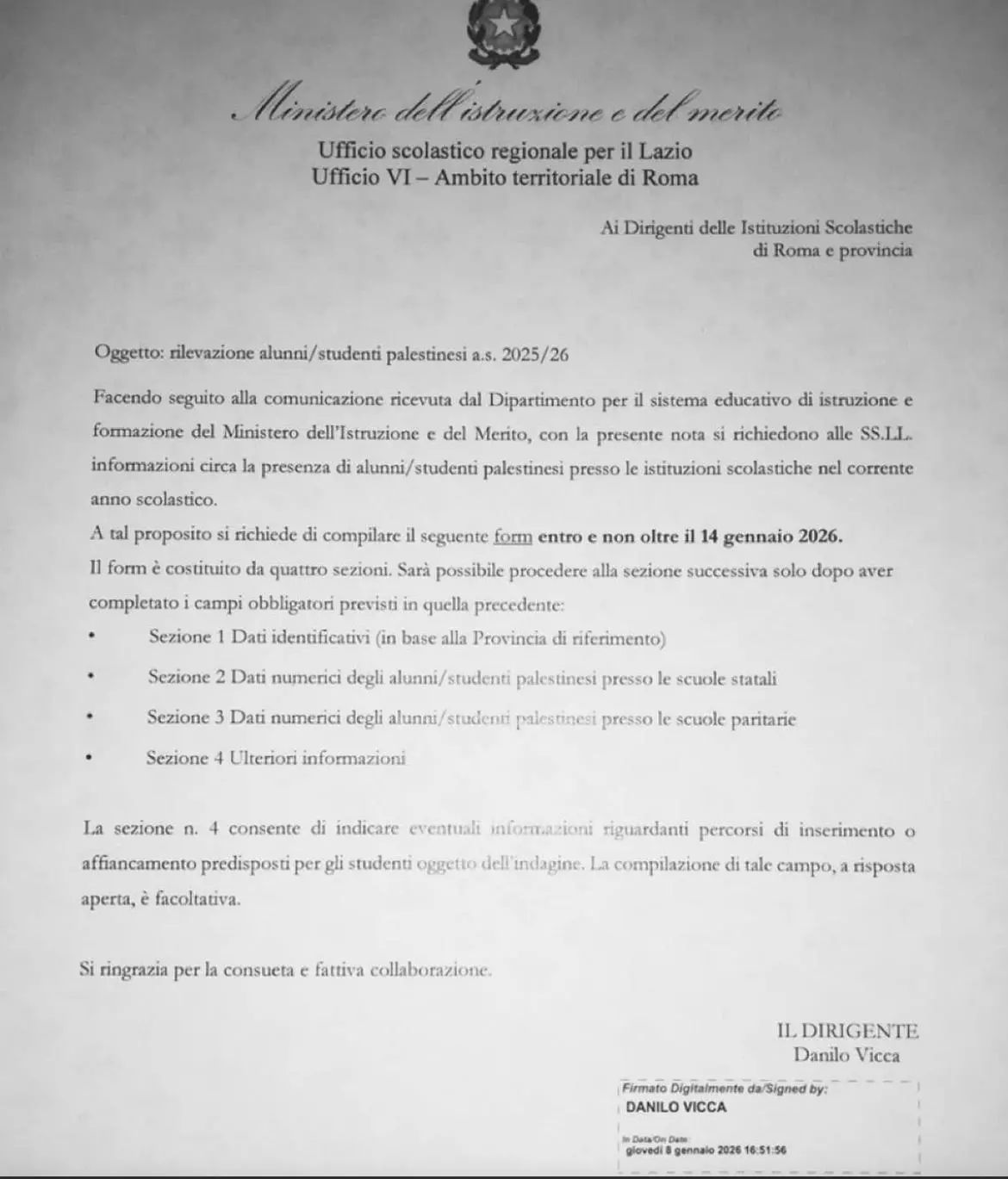 “Facendo seguito alla comunicazione ricevuta dal Dipartimento per il sistema educativo di istruzione e formazione del Ministero dell’Istruzione e del Merito con la presente nota si chiedono alle Ss.Ll. informazioni circa la presenza di alunnni/studenti palestinesi presso le istituzioni scolastiche nel presente anno scolastico”.