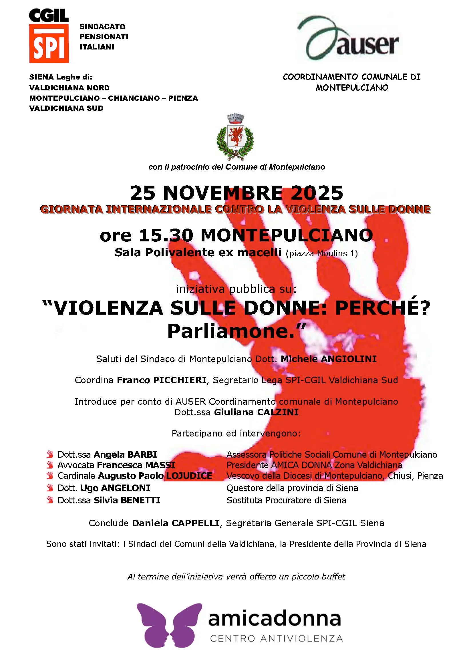 Due le iniziative in provincia di Siena. Il 25 novembre a Montepulciano: “Violenza sulle donne: perché? Parliamone”.